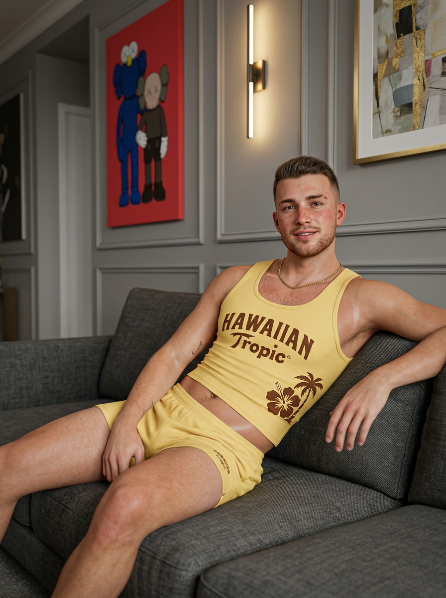 {"prompt_data":{"subject":{"description":"young model with short, styled hair and a light stubble","features":"Natural skin texture with tan lines on the chest, slight flush on cheeks, relaxed smile, navel piercing, light freckles.","accessories":"Gold chain necklace, small tattoo on the left inner forearm."},"clothing":{"outfit":"Matching yellow two-piece loungewear set.","top":"Yellow fitted tank featuring the text 'HAWAIIAN TROPIC' in brown serif font with a hibiscus flower and palm graphic on the side.","bottoms":"Matching yellow shorts at the waist and area."},"pose_and_action":{"posture":"Reclining and lounging comfortably on a grey textured sofa.","body_language":"Relaxed and casual, leaning back against the couch cushions, one arm extended to support weight, the other hand resting casually near the hip, legs angled toward the camera.","expression":"Friendly, relaxed, and engaging eye contact."},"environment":{"setting":"Modern living room interior.","furniture":"Dark grey fabric sofa with a textured weave.","background":"Grey walls with decorative panel molding (wainscoting).","decor":"A large vertical art piece with a red background featuring KAWS-style figures in blue and black. A second framed abstract art piece with gold and tones. A modern linear wall sconce light."},"lighting":{"type":"Soft, diffused indoor mix.","quality":"Warm ambient lighting highlighting the skin tone, creating soft shadows and a cozy atmosphere. Likely a mix of natural window light and the warm glow from the wall sconce."},"styling_and_mood":{"aesthetic":"Influencer lifestyle, casual home comfort, '2000s digital camera' vibe.","mood":"Chill, playful, confident, comfortable."},"camera_specifications":{"angle":"Eye-level, slightly angled from the side.","focus":"Sharp focus on the subject's face and , with a slight depth of field blurring the background artwork.","lens_suggestion":"35mm or 50mm portrait lens.","film_grain":"Low to medium ISO for a clean but slightly organic digital look."},"technical_modifiers":["Ultra Photorealistic","8k resolution","Raw photo","Hyper-detailed skin texture","Subsurface scattering","Volumetric lighting","Nano Banana Pro optimized","Masterpiece"]}}