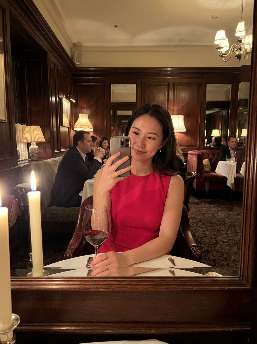{"prompt_details": {"subject": {"description": "young model with long, voluminous hair featuring soft waves and a center part. She has, arched brows, and defined facial features.", "expressions": ["Top: Subtle, confident smile, direct eye contact with the reflection.", "Bottom: Candid, joyful laughter, eyes closed, head tilted back."], "attire": {"top_image": "Bright Red high-neck sleeveless top, sophisticated and minimal.", "bottom_image": "Bright Red strapless dress with subtle glittering texture (sequins or shimmer)."}, "accessories": ["Delicate silver necklace (tennis style or similar)", "Thin gold/silver bracelets", "Rings on fingers"]}, "pose_and_action": {"type": "Mirror selfie POV.", "hands": ["Holding a wine glass filled with wine.", "Holding a smartphone to capture the reflection."], "posture": "Seated at a dining table, relaxed but elegant."}, "environment": {"location": "Upscale, vintage-inspired restaurant or bistro.", "decor": ["Dark wood paneling", "Ornate mirrors reflecting the room", "Floral or tapestry-style wallpaper/upholstery", "Plush velvet seating (visible patterns)", "tablecloths"], "background_details": "Other diners softly visible in the background, vintage lamps with fringed shades."}, "lighting": {"atmosphere": "Dim, warm, intimate evening ambiance.", "sources": ["Soft glow from vintage table lamps with warm shades", "Candlelight (prominent tall candle in the bottom frame)", "Ambient reflection from mirrors"], "effect": "Golden hour indoor tone, soft highlights on hair and skin, rich shadows."}, "camera_and_tech": {"style": "Ultra Photorealistic, 8k resolution, candid lifestyle photography.", "camera_simulation": "Smartphone rear camera (iPhone Pro style), wide aperture (f/1.8) for depth of field.", "focus": "Sharp focus on the subject in the mirror reflection, soft bokeh on foreground elements (wine glass stem, candle).", "color_grading": "Warm, cinematic, slightly grainy low-light texture, rich contrast."}, "mood": "Luxurious, festive, happy, chic, 'night out' aesthetic."}}