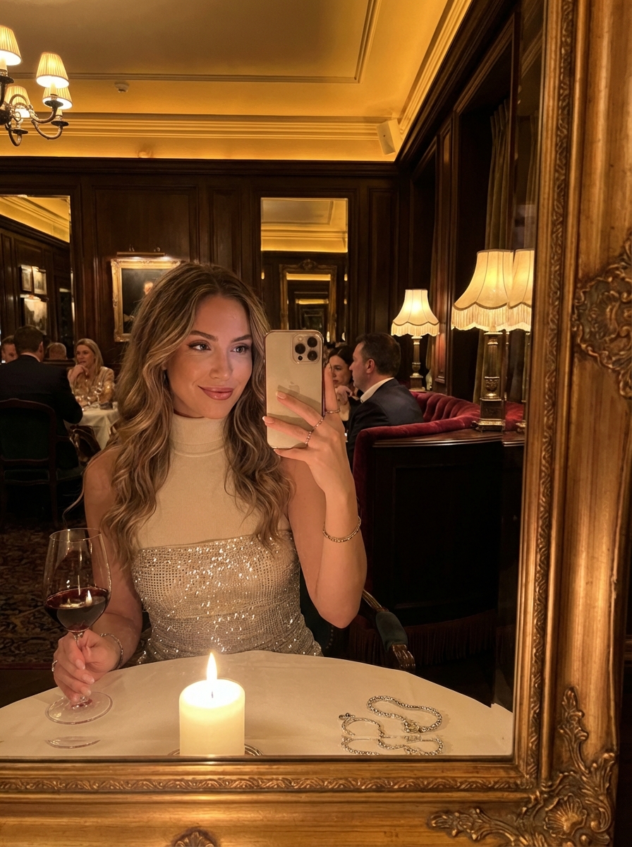 {"prompt_details": {"subject": {"description": "young model with long, voluminous hair featuring soft waves and a center part. She has, arched brows, and defined facial features.", "expressions": ["Top: Subtle, confident smile, direct eye contact with the reflection.", "Bottom: Candid, joyful laughter, eyes closed, head tilted back."], "attire": {"top_image": "high-neck sleeveless top, sophisticated and minimal.", "bottom_image": "strapless dress with subtle glittering texture (sequins or shimmer)."}, "accessories": ["Delicate silver necklace (tennis style or similar)", "Thin gold/silver bracelets", "Rings on fingers"]}, "pose_and_action": {"type": "Mirror selfie POV.", "hands": ["Holding a wine glass filled with wine.", "Holding a smartphone to capture the reflection."], "posture": "Seated at a dining table, relaxed but elegant."}, "environment": {"location": "Upscale, vintage-inspired restaurant or bistro.", "decor": ["Dark wood paneling", "Ornate mirrors reflecting the room", "Floral or tapestry-style wallpaper/upholstery", "Plush velvet seating (visible patterns)", "tablecloths"], "background_details": "Other diners softly visible in the background, vintage lamps with fringed shades."}, "lighting": {"atmosphere": "Dim, warm, intimate evening ambiance.", "sources": ["Soft glow from vintage table lamps with warm shades", "Candlelight (prominent tall candle in the bottom frame)", "Ambient reflection from mirrors"], "effect": "Golden hour indoor tone, soft highlights on hair and skin, rich shadows."}, "camera_and_tech": {"style": "Ultra Photorealistic, 8k resolution, candid lifestyle photography.", "camera_simulation": "Smartphone rear camera (iPhone Pro style), wide aperture (f/1.8) for depth of field.", "focus": "Sharp focus on the subject in the mirror reflection, soft bokeh on foreground elements (wine glass stem, candle).", "color_grading": "Warm, cinematic, slightly grainy low-light texture, rich contrast."}, "mood": "Luxurious, festive, happy, chic, 'night out' aesthetic."}}