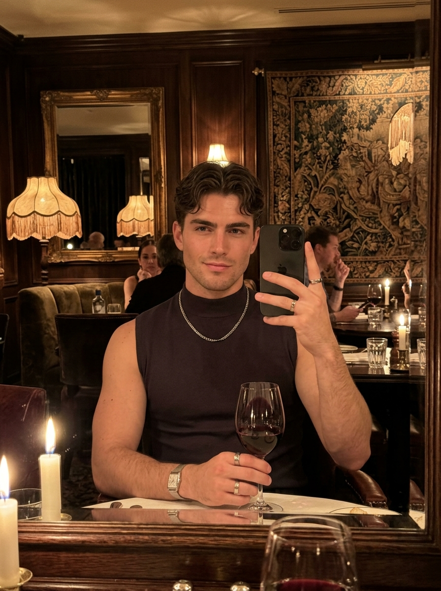 {"prompt_details":{"subject":{"description":"young male model with short, textured hair featuring soft waves and a center part. He has strong brows, and defined facial features.","expressions":["Top: Subtle, confident smile, direct eye contact with the reflection.","Bottom: Candid, joyful laughter, eyes closed, head tilted back."],"attire":{"top_image":"high-neck sleeveless fitted t-shirt, sophisticated and minimal.","bottom_image":"tailored outfit with subtle glittering texture (sequins or shimmer)."},"accessories":["Masculine silver chain necklace","Thin silver watch","Rings on fingers"]},"pose_and_action":{"type":"Mirror selfie POV.","hands":["Holding a wine glass filled with wine.","Holding a smartphone to capture the reflection."],"posture":"Seated at a dining table, relaxed but confident."},"environment":{"location":"Upscale, vintage-inspired restaurant or bistro.","decor":["Dark wood paneling","Ornate mirrors reflecting the room","Floral or tapestry-style wallpaper\/upholstery","Plush velvet seating ( patterns)","tablecloths"],"background_details":"Other diners softly in the background, vintage lamps with fringed shades."},"lighting":{"atmosphere":"Dim, warm, evening ambiance.","sources":["Soft glow from vintage table lamps with warm shades","Candlelight (prominent tall candle in the bottom frame)","Ambient reflection from mirrors"],"effect":"Golden hour indoor tone, soft highlights on hair and skin, rich shadows."},"camera_and_tech":{"style":"Ultra Photorealistic, 8k resolution, candid lifestyle photography.","camera_simulation":"Smartphone rear camera (iPhone Pro style), wide aperture (f\/1.8) for depth of field.","focus":"Sharp focus on the subject in the mirror reflection, soft bokeh on foreground elements (wine glass stem, candle).","color_grading":"Warm, cinematic, slightly grainy low-light texture, rich contrast."},"mood":"Luxurious, festive, happy, chic, 'night out' aesthetic."}}