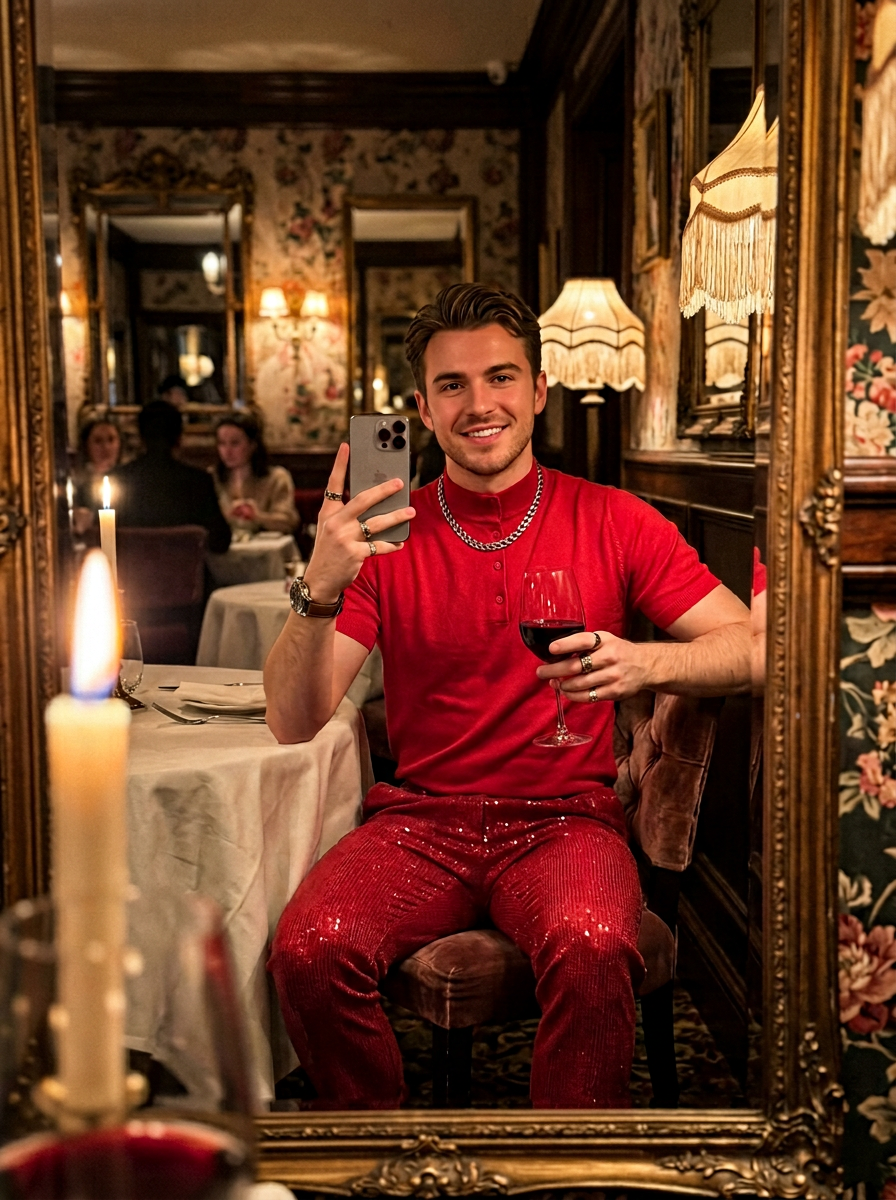 {"prompt_details":{"subject":{"description":"young model with short, textured hair featuring soft waves and a side part. He has strong brows, and chiseled facial features with light stubble.","expressions":["Top: Subtle, confident smile, direct eye contact with the reflection.","Bottom: Candid, joyful laughter, eyes closed, head tilted back."],"attire":{"top_image":"Bright Red high-neck short-sleeve henley shirt, sophisticated and minimal.","bottom_image":"Bright Red slim-fit trousers with subtle glittering texture (sequins or shimmer)."},"accessories":["Chunky silver chain necklace","Leather and metal watch","Rings on fingers"]},"pose_and_action":{"type":"Mirror selfie POV.","hands":["Holding a wine glass filled with wine.","Holding a smartphone to capture the reflection."],"posture":"Seated at a dining table, relaxed but confident."},"environment":{"location":"Upscale, vintage-inspired restaurant or bistro.","decor":["Dark wood paneling","Ornate mirrors reflecting the room","Floral or tapestry-style wallpaper\/upholstery","Plush velvet seating ( patterns)","tablecloths"],"background_details":"Other diners softly in the background, vintage lamps with fringed shades."},"lighting":{"atmosphere":"Dim, warm, evening ambiance.","sources":["Soft glow from vintage table lamps with warm shades","Candlelight (prominent tall candle in the bottom frame)","Ambient reflection from mirrors"],"effect":"Golden hour indoor tone, soft highlights on hair and skin, rich shadows."},"camera_and_tech":{"style":"Ultra Photorealistic, 8k resolution, candid lifestyle photography.","camera_simulation":"Smartphone rear camera (iPhone Pro style), wide aperture (f\/1.8) for depth of field.","focus":"Sharp focus on the subject in the mirror reflection, soft bokeh on foreground elements (wine glass stem, candle).","color_grading":"Warm, cinematic, slightly grainy low-light texture, rich contrast."},"mood":"Luxurious, festive, happy, chic, 'night out' aesthetic."}}