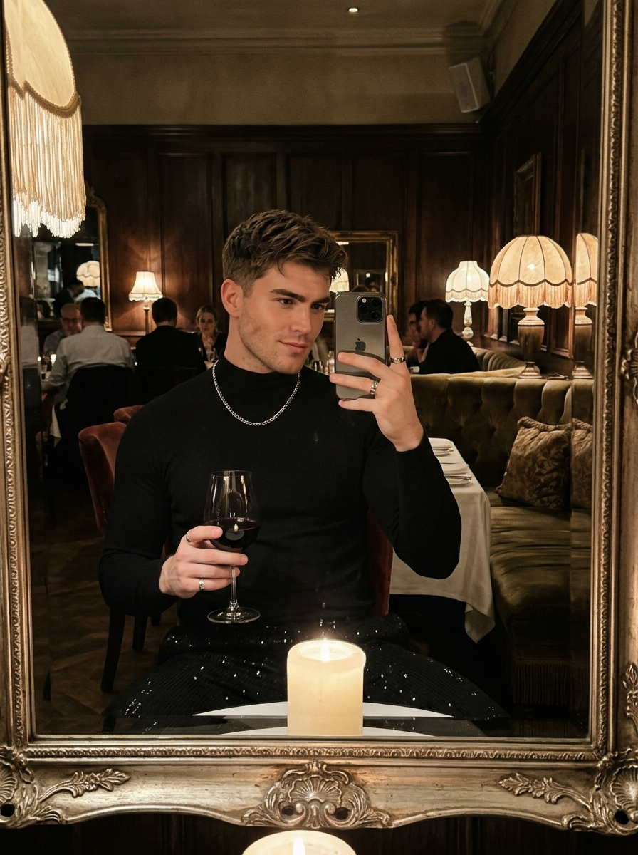 {"prompt_details":{"subject":{"description":"young model with short, textured hair featuring a side part. He has strong brows, chiseled jawline, and defined facial features.","expressions":["Top: Subtle, confident smile, direct eye contact with the reflection.","Bottom: Candid, joyful laughter, eyes closed, head tilted back."],"attire":{"top_image":"high-neck fitted shirt, sophisticated and minimal.","bottom_image":"tailored trousers with subtle glittering texture (sequins or shimmer)."},"accessories":["Masculine silver chain necklace","Watch on wrist","Rings on fingers"]},"pose_and_action":{"type":"Mirror selfie POV.","hands":["Holding a wine glass filled with wine.","Holding a smartphone to capture the reflection."],"posture":"Seated at a dining table, relaxed but confident."},"environment":{"location":"Upscale, vintage-inspired restaurant or bistro.","decor":["Dark wood paneling","Ornate mirrors reflecting the room","Floral or tapestry-style wallpaper\/upholstery","Plush velvet seating ( patterns)","tablecloths"],"background_details":"Other diners softly in the background, vintage lamps with fringed shades."},"lighting":{"atmosphere":"Dim, warm, evening ambiance.","sources":["Soft glow from vintage table lamps with warm shades","Candlelight (prominent tall candle in the bottom frame)","Ambient reflection from mirrors"],"effect":"Golden hour indoor tone, soft highlights on hair and skin, rich shadows."},"camera_and_tech":{"style":"Ultra Photorealistic, 8k resolution, candid lifestyle photography.","camera_simulation":"Smartphone rear camera (iPhone Pro style), wide aperture (f\/1.8) for depth of field.","focus":"Sharp focus on the subject in the mirror reflection, soft bokeh on foreground elements (wine glass stem, candle).","color_grading":"Warm, cinematic, slightly grainy low-light texture, rich contrast."},"mood":"Luxurious, festive, happy, chic, 'night out' aesthetic."}}