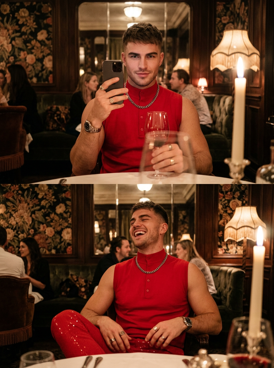 {"prompt_details":{"subject":{"description":"young model with short, textured hair featuring a crop cut and side part. He has strong brows, and chiseled facial features with light stubble.","expressions":["Top: Subtle, confident smile, direct eye contact with the reflection.","Bottom: Candid, joyful laughter, eyes closed, head tilted back."],"attire":{"top_image":"Bright Red high-neck sleeveless henley shirt, sophisticated and minimal.","bottom_image":"Bright Red slim-fit trousers with subtle glittering texture (sequins or shimmer)."},"accessories":["Thick silver chain necklace","Masculine wristwatch","Signet rings on fingers"]},"pose_and_action":{"type":"Mirror selfie POV.","hands":["Holding a wine glass filled with wine.","Holding a smartphone to capture the reflection."],"posture":"Seated at a dining table, relaxed but confident."},"environment":{"location":"Upscale, vintage-inspired restaurant or bistro.","decor":["Dark wood paneling","Ornate mirrors reflecting the room","Floral or tapestry-style wallpaper\/upholstery","Plush velvet seating ( patterns)","tablecloths"],"background_details":"Other diners softly in the background, vintage lamps with fringed shades."},"lighting":{"atmosphere":"Dim, warm, evening ambiance.","sources":["Soft glow from vintage table lamps with warm shades","Candlelight (prominent tall candle in the bottom frame)","Ambient reflection from mirrors"],"effect":"Golden hour indoor tone, soft highlights on hair and skin, rich shadows."},"camera_and_tech":{"style":"Ultra Photorealistic, 8k resolution, candid lifestyle photography.","camera_simulation":"Smartphone rear camera (iPhone Pro style), wide aperture (f\/1.8) for depth of field.","focus":"Sharp focus on the subject in the mirror reflection, soft bokeh on foreground elements (wine glass stem, candle).","color_grading":"Warm, cinematic, slightly grainy low-light texture, rich contrast."},"mood":"Luxurious, festive, happy, chic, 'night out' aesthetic."}}