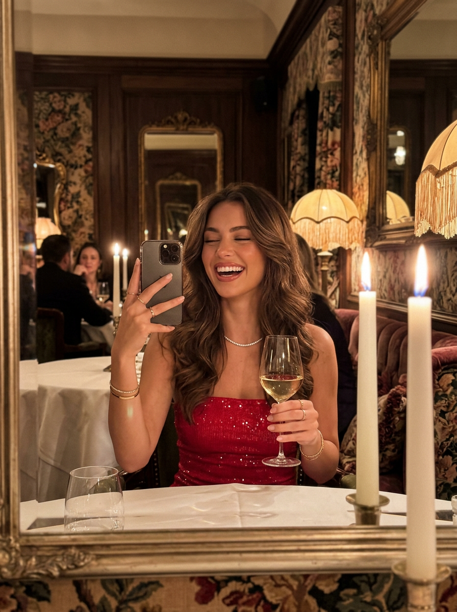 {"prompt_details":{"subject":{"description":"Young model with long, voluminous brunette hair featuring soft waves and a center part. She has almond-shaped eyes, arched brows, and defined facial features.","expressions":["Top: Subtle, confident smile, direct eye contact with the reflection.","Bottom: Candid, joyful laughter, eyes closed, head tilted back."],"attire":{"top_image":"Bright Red high-neck sleeveless top, sophisticated and minimal.","bottom_image":"Bright Red strapless dress with subtle glittering texture (sequins or shimmer)."},"accessories":["Delicate silver necklace (tennis style or similar)","Thin gold\/silver bracelets","Rings on fingers"]},"pose_and_action":{"type":"Mirror selfie POV.","hands":["Holding a wine glass filled with white wine.","Holding a smartphone to capture the reflection."],"posture":"Seated at a dining table, relaxed but elegant."},"environment":{"location":"Upscale, vintage-inspired restaurant or bistro.","decor":["Dark wood paneling","Ornate mirrors reflecting the room","Floral or tapestry-style wallpaper\/upholstery","Plush velvet seating ( patterns)","White tablecloths"],"background_details":"Other diners softly in the background, vintage lamps with fringed shades."},"lighting":{"atmosphere":"Dim, warm, evening ambiance.","sources":["Soft glow from vintage table lamps with warm shades","Candlelight (prominent tall white candle in the bottom frame)","Ambient reflection from mirrors"],"effect":"Golden hour indoor tone, soft highlights on hair and skin, rich shadows."},"camera_and_tech":{"style":"Ultra Photorealistic, 8k resolution, candid lifestyle photography.","camera_simulation":"Smartphone rear camera (iPhone Pro style), wide aperture (f\/1.8) for depth of field.","focus":"Sharp focus on the subject in the mirror reflection, soft bokeh on foreground elements (wine glass stem, candle).","color_grading":"Warm, cinematic, slightly grainy low-light texture, rich contrast."},"mood":"Luxurious, festive, happy, chic, 'night out' aesthetic."}}