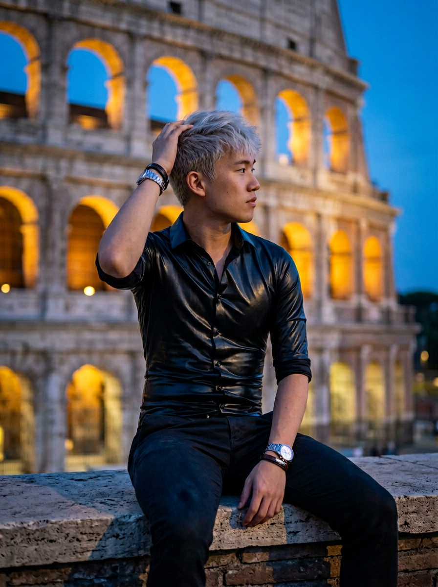 {"prompt_scheme":{"subject_description":{"main":"Handsome young model with short, textured platinum hair and an athletic build","outfit":"fitted latex shirt","pose":"Seated on a stone ledge, legs relaxed, one hand running through hair, looking away to the side, confident profile view","details":"East Asian facial features, well-groomed appearance, defined natural features, groomed nails, silver watch, leather bracelet"},"environment_context":{"location":"The Colosseum, Rome, Italy","background_elements":"Ancient Roman stone arches, illuminated with warm yellow architectural lights","sky":"Deep twilight blue sky (blue hour), evening atmosphere","depth":"Background slightly out of focus (bokeh) to emphasize subject"},"lighting_and_atmosphere":{"type":"Cinematic mixed lighting","specifics":"Warm artificial glow on the building, soft warm key light on the subject's face, contrasting with the cool blue tones of the sky","mood":"Romantic, travel luxury, evening glamour, atmospheric"},"camera_settings":{"style":"High-end travel photography, DSLR","focal_length":"50mm or 85mm portrait lens","aperture":"f\/2.8 for depth of field","quality":"8k resolution, sharp focus, photorealistic, highly detailed texture"},"full_prompt_constructed":"A hyper-realistic medium shot of a handsome young model with an athletic build and short platinum hair sitting on a stone ledge in front of the Colosseum in Rome at twilight. He is wearing a sleek fitted latex shirt, posing with one hand running through his hair, looking confidently to the side. The background features the iconic ancient arches of the Colosseum illuminated by warm golden lights against a deep blue evening sky. Cinematic lighting, soft skin texture, 8k resolution, shot on 35mm film, travel influencer aesthetic, highly detailed."}}