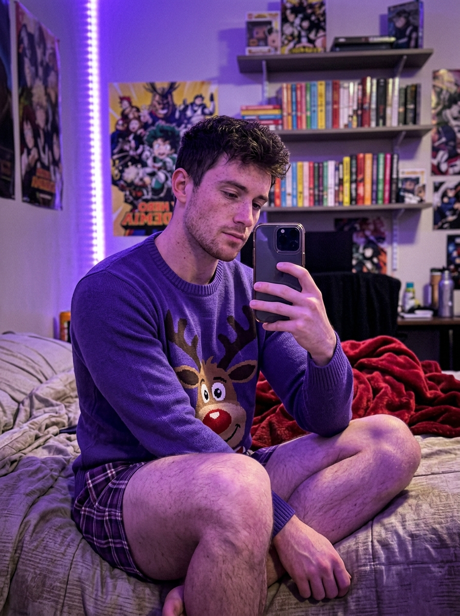 {"prompt_structure":{"subject_details":{"demographics":"Young male model, toned athletic build, natural appearance with distinct freckles across nose and cheeks","facial_features":"Defined facial structure with light stubble, neutral expression, gaze directed down at phone","hair":"Short dark brown textured crop, slightly tousled","clothing":{"top":"Purple crewneck holiday sweater featuring a large cartoon reindeer face","bottom":"Purple plaid pajama shorts (only small section at upper )"},"pose":"Sitting upright on a bed, body angled slightly to viewer's left. Both legs are bent sharply at the knees and drawn up tightly against the . The shins are prominent, and feet are tucked near the buttocks. Right hand holds a smartphone with a case up in front of the body to take a selfie."},"environment_context":{"setting":"Gen Z bedroom \/ dorm room context","background_elements":["floating shelves packed with diverse colorful books","Anime posters on walls (My Hero Academia clearly )","LED strip lights running vertically along the wall corner","Messy unmade bed with textured duvet or blanket","Crumpled red fleece throw blanket in background on bed"]},"lighting_atmosphere":{"primary_source":"Dominant Purple\/Violet LED ambient lighting originating from corner strip","quality":"Dim, soft, moody, atmospheric, strong colored purple cast on skin, clothing, and surroundings","shadows":"Soft, diffused shadows created by the ambient colored light"},"camera_technical":{"style":"Casual Smartphone Selfie, Candid shot","simulation":"Smartphone Main Sensor Simulation","angle":"Slightly low angle, looking slightly up at the subject","focal_length":"Approx 24-28mm wide angle (phone lens equivalent)","aperture":"f\/1.7 wide open","iso":"High ISO (approx 800-1600) resulting in fine digital noise\/grain","focus":"Sharp focus on subject's face and knees, slight depth of field blur on background bookshelf"},"quality_modifiers":{"engine":"Nano Banana Pro","details":"Ultra Photorealistic, 8k resolution, raw photo style, realistic skin texture with highly pores and freckles underneath purple light, tangible fabric texture details on sweater and blanket, a"}}}