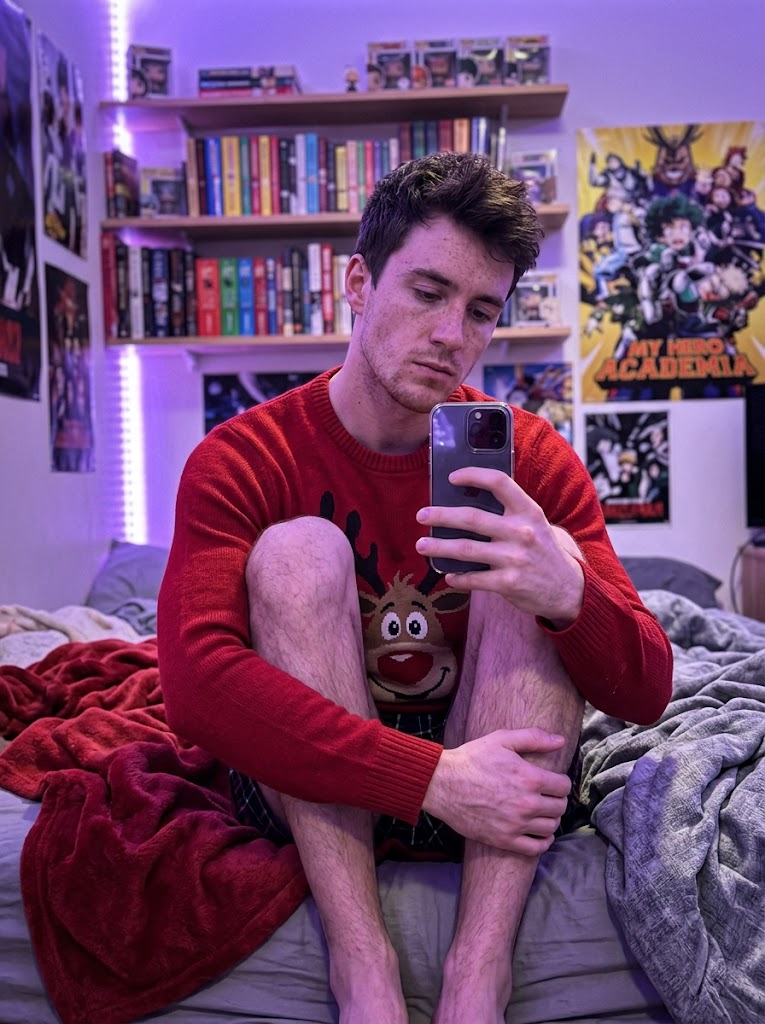 {"prompt_structure":{"subject_details":{"demographics":"Young male model, toned athletic build, natural appearance with distinct freckles across nose and cheeks","facial_features":"Defined jawline and strong facial structure, neutral expression with light stubble, gaze directed down at phone","hair":"Short, dark brown, tousled textured cut","clothing":{"top":"Red crewneck holiday sweater featuring a large cartoon reindeer face","bottom":"Plaid pajama shorts (only small section at upper )"},"pose":"Sitting upright on a bed with confident posture, body angled slightly to viewer's left. Both legs are bent sharply at the knees and drawn up tightly against the . The shins are prominent, and feet are tucked near the buttocks. Right hand holds a smartphone with a case up in front of the body to take a selfie."},"environment_context":{"setting":"Gen Z bedroom \/ dorm room context","background_elements":["floating shelves packed with diverse colorful books","Anime posters on walls (My Hero Academia clearly )","LED strip lights running vertically along the wall corner","Messy unmade bed with textured duvet or blanket","Crumpled red fleece throw blanket in background on bed"]},"lighting_atmosphere":{"primary_source":"Dominant Purple\/Violet LED ambient lighting originating from corner strip","quality":"Dim, soft, moody, atmospheric, strong colored purple cast on skin, clothing, and surroundings","shadows":"Soft, diffused shadows created by the ambient colored light"},"camera_technical":{"style":"Casual Smartphone Selfie, Candid shot","simulation":"Smartphone Main Sensor Simulation","angle":"Slightly low angle, looking slightly up at the subject","focal_length":"Approx 24-28mm wide angle (phone lens equivalent)","aperture":"f\/1.7 wide open","iso":"High ISO (approx 800-1600) resulting in fine digital noise\/grain","focus":"Sharp focus on subject's face and knees, slight depth of field blur on background bookshelf"},"quality_modifiers":{"engine":"Nano Banana Pro","details":"Ultra Photorealistic, 8k resolution, raw photo style, realistic skin texture with highly pores, freckles, and light stubble underneath purple light, tangible fabric texture details on sweater and blanket, authentic low-light smartphone digital noise grain."},"negative_prompt":"cartoon, illustration, anime, painting, 3D render, drawing, sketch, abstract, low quality, blurry, pixelated, unnatural skin, doll-like, oversaturated, flat lighting, stylized, idealized, unrealistic, smooth skin, denoised"}}
