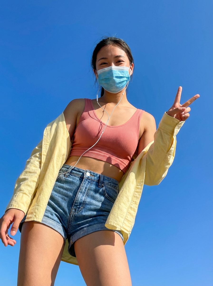{"prompt_title": "Dynamic Low-Angle Portrait Under Clear Sky - Emphasized Curves & Confident Pose", "woman_type": "Hyper-Realistic Photo", "style": ["Ultra-detailed photo-realism", "Bright, high-contrast natural outdoor lighting", "Extreme low-angle, wide-perspective shot (heroic/empowering feel)", "Vibrant, saturated colors (clean, modern aesthetic)"], "subject": {"description": "A youthful, radiant East, late teens to early twenties, with a confident and engaging presence. Her skin exhibits a flawless yet natural texture, with subtle pores and a healthy, sunlit sheen across exposed areas like her shoulders and midriff. Hair strands are individually discernible.", "physique": "Athletic and toned, with visibly sculpted abdominal muscles, subtly defined obliques, and strong, shapely thighs. The pose emphasizes the natural curve of her hips and the gentle arch of her lower back, creating an alluring yet powerful silhouette from the low angle.", "hair": "Long, silky, straight hair, with a subtle natural wave at the ends. It flows freely around her shoulders and back, with a few strands gently lifted by a breeze (if applicable, or perfectly styled to look natural). A fringe or wispy bangs are subtly visible beneath the mask, framing her upper face.", "makeup": "Minimal, natural 'no-makeup' makeup. Clear, dewy skin finish. The visible eye area shows defined but natural brows, a hint of mascara on long lashes , and a subtle shimmer on the inner corner of the eyes. The mask obscures the mouth and nose.", "expression": "Her eyes are wide, bright, and directly engaging with the viewer, conveying a sense of playful confidence and warmth. The raised peace sign reinforces a cheerful, positive mood.", "attire": {"mask": "A pristine, well-fitted disposable surgical mask, with clear pleats and elastic ear loops visible against her skin. It cleanly covers her nose and mouth.", "top": "A figure-hugging, finely ribbed, light salmon-pink (or dusty rose) crop tank top . The ribbing texture is highly detailed, stretching smoothly over her chest and torso, emphasizing the curve of her bust and the tautness of her midriff.", "outerwear": "An oversized, buttery soft, light pale yellow long-sleeved button-up shirt or lightweight jacket. It's worn open, casually draped off her shoulders, with the sleeves pushed up slightly, creating soft, natural folds in the fabric. The collar and cuffs are slightly relaxed.", "bottom": "Form-fitting, short denim shorts. The fabric texture is detailed, showing subtle denim weave. The shorts sit high on her hips, emphasizing the curve of her waist and thighs. Stitching details and a faint outline of pockets are visible.", "accessories": "wired earphones with clearly visible, delicate wires extending from her ears, subtly contrasting with her hair. The earbud tips are visible."}}, "setting": {"location": "Outdoors on an exceptionally clear, bright summer day.", "background_elements": ["A vast, perfectly uniform, intensely vibrant cerulean blue sky, completely devoid of clouds, creating a stark, graphic backdrop that makes the subject pop.", "No horizon line or ground visible, making the sky appear infinite and emphasizing the extreme low-angle perspective."], "atmosphere": "Crisp, clean air; intense feeling of open space and boundless energy."}, "pose": {"type": "Extreme low-angle, dynamic full-body portrait (cropped at upper thigh/hip level, shot from below).", "stance": "the model is standing with her weight slightly shifted, her left leg subtly bent at the knee, and her right leg extended, creating a dynamic 'power stance' effect. Her torso is slightly twisted to her left, further accentuating the curve of her waist and hips, especially from the low vantage point. Her chest is slightly pushed out, enhancing the natural curve of her bust .", "gaze": "Directly into the camera, with a confident, open, and friendly expression in her visible eyes. This strong eye contact creates an immediate connection with the viewer.", "gesture": "Her left arm is bent at the elbow, and her left hand is raised close to her face, palm facing outwards, forming a clear and crisp 'peace' (V-sign) with her index and middle fingers. The other fingers are gently curled down. Her right arm is relaxed at her side, with the jacket draped over it. The natural tension in her arm muscles is visible."}, "camera_and_technical": {"camera": "Sony A1 with G Master Lenses or RED Komodo (for cinematic quality)", "lens": "20mm f/1.8 (Ultra-wide-angle prime lens to exaggerate the low perspective and create an imposing, almost monumental feel for the subject)", "shot_type": "Extreme Worm's-Eye View / Dynamic Low-Angle Medium Full Shot (from just below the subject's waist).", "composition": "The subject dominates the central frame, with her head and raised hand reaching towards the top. The expansive blue sky provides a clean, impactful negative space. The extreme low angle distorts proportions intentionally, elongating the legs and making the subject appear powerful and larger-than-life.", "depth_of_field": "Deep (f/11 to ensure absolute sharpness from her shorts to the distant sky, minimizing any softness).", "aperture": "f/11", "shutter_speed": "1/800s (to eliminate any possibility of motion blur and ensure tack-sharp details under intense sunlight)", "iso": "ISO 64 (for maximum image fidelity and dynamic range)", "resolution": "12K, cinematic wide aspect ratio (e.g., 1.85:1 or 16:9), emphasizing microscopic details of fabric weaves, skin pores, and the pristine blue sky. Post-processing for subtle vignetting and color grading for vibrant pop.", "white_balance": "Daylight (5200K), precisely calibrated for natural colors under bright sun."}, "lighting": {"overall_mood": "High-key, crisp, and clean with stark yet appealing contrast.", "key_light": {"source": "Direct, unfiltered overhead sunlight, creating strong, well-defined form.", "position": "High above and slightly in front-right of the subject, casting clear, defin