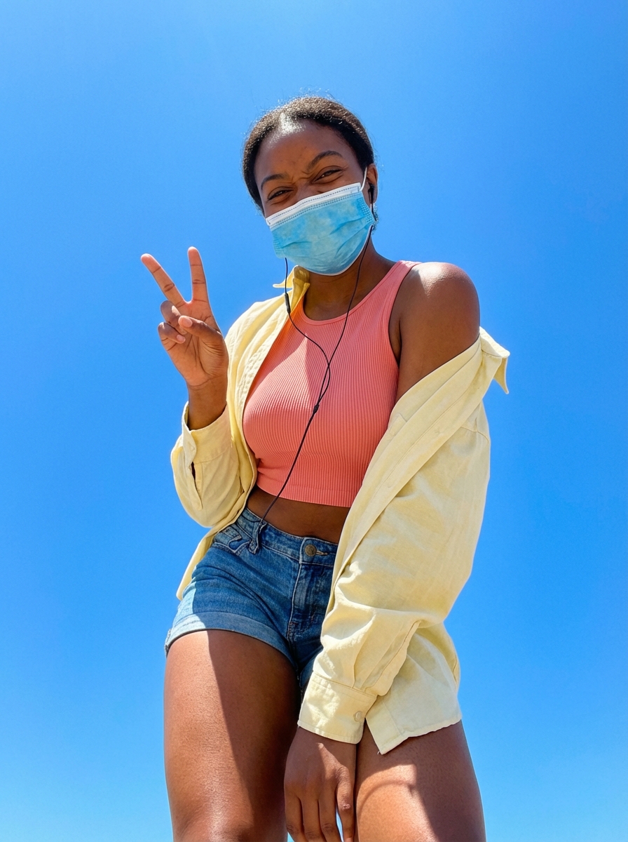 {"prompt_title": "Dynamic Low-Angle Portrait Under Clear Sky - Emphasized Curves & Confident Pose", "woman_type": "Hyper-Realistic Photo", "style": ["Ultra-detailed photo-realism", "Bright, high-contrast natural outdoor lighting", "Extreme low-angle, wide-perspective shot (heroic/empowering feel)", "Vibrant, saturated colors (clean, modern aesthetic)"], "subject": {"description": "A youthful, radiant East, late teens to early twenties, with a confident and engaging presence. Her skin exhibits a flawless yet natural texture, with subtle pores and a healthy, sunlit sheen across exposed areas like her shoulders and midriff. Hair strands are individually discernible.", "physique": "Athletic and toned, with visibly sculpted abdominal muscles, subtly defined obliques, and strong, shapely thighs. The pose emphasizes the natural curve of her hips and the gentle arch of her lower back, creating an alluring yet powerful silhouette from the low angle.", "hair": "Long, silky, straight hair, with a subtle natural wave at the ends. It flows freely around her shoulders and back, with a few strands gently lifted by a breeze (if applicable, or perfectly styled to look natural). A fringe or wispy bangs are subtly visible beneath the mask, framing her upper face.", "makeup": "Minimal, natural 'no-makeup' makeup. Clear, dewy skin finish. The visible eye area shows defined but natural brows, a hint of mascara on long lashes , and a subtle shimmer on the inner corner of the eyes. The mask obscures the mouth and nose.", "expression": "Her eyes are wide, bright, and directly engaging with the viewer, conveying a sense of playful confidence and warmth. The raised peace sign reinforces a cheerful, positive mood.", "attire": {"mask": "A pristine, well-fitted disposable surgical mask, with clear pleats and elastic ear loops visible against her skin. It cleanly covers her nose and mouth.", "top": "A figure-hugging, finely ribbed, light salmon-pink (or dusty rose) crop tank top . The ribbing texture is highly detailed, stretching smoothly over her chest and torso, emphasizing the curve of her bust and the tautness of her midriff.", "outerwear": "An oversized, buttery soft, light pale yellow long-sleeved button-up shirt or lightweight jacket. It's worn open, casually draped off her shoulders, with the sleeves pushed up slightly, creating soft, natural folds in the fabric. The collar and cuffs are slightly relaxed.", "bottom": "Form-fitting, short denim shorts. The fabric texture is detailed, showing subtle denim weave. The shorts sit high on her hips, emphasizing the curve of her waist and thighs. Stitching details and a faint outline of pockets are visible.", "accessories": "wired earphones with clearly visible, delicate wires extending from her ears, subtly contrasting with her hair. The earbud tips are visible."}}, "setting": {"location": "Outdoors on an exceptionally clear, bright summer day.", "background_elements": ["A vast, perfectly uniform, intensely vibrant cerulean blue sky, completely devoid of clouds, creating a stark, graphic backdrop that makes the subject pop.", "No horizon line or ground visible, making the sky appear infinite and emphasizing the extreme low-angle perspective."], "atmosphere": "Crisp, clean air; intense feeling of open space and boundless energy."}, "pose": {"type": "Extreme low-angle, dynamic full-body portrait (cropped at upper thigh/hip level, shot from below).", "stance": "the model is standing with her weight slightly shifted, her left leg subtly bent at the knee, and her right leg extended, creating a dynamic 'power stance' effect. Her torso is slightly twisted to her left, further accentuating the curve of her waist and hips, especially from the low vantage point. Her chest is slightly pushed out, enhancing the natural curve of her bust .", "gaze": "Directly into the camera, with a confident, open, and friendly expression in her visible eyes. This strong eye contact creates an immediate connection with the viewer.", "gesture": "Her left arm is bent at the elbow, and her left hand is raised close to her face, palm facing outwards, forming a clear and crisp 'peace' (V-sign) with her index and middle fingers. The other fingers are gently curled down. Her right arm is relaxed at her side, with the jacket draped over it. The natural tension in her arm muscles is visible."}, "camera_and_technical": {"camera": "Sony A1 with G Master Lenses or RED Komodo (for cinematic quality)", "lens": "20mm f/1.8 (Ultra-wide-angle prime lens to exaggerate the low perspective and create an imposing, almost monumental feel for the subject)", "shot_type": "Extreme Worm's-Eye View / Dynamic Low-Angle Medium Full Shot (from just below the subject's waist).", "composition": "The subject dominates the central frame, with her head and raised hand reaching towards the top. The expansive blue sky provides a clean, impactful negative space. The extreme low angle distorts proportions intentionally, elongating the legs and making the subject appear powerful and larger-than-life.", "depth_of_field": "Deep (f/11 to ensure absolute sharpness from her shorts to the distant sky, minimizing any softness).", "aperture": "f/11", "shutter_speed": "1/800s (to eliminate any possibility of motion blur and ensure tack-sharp details under intense sunlight)", "iso": "ISO 64 (for maximum image fidelity and dynamic range)", "resolution": "12K, cinematic wide aspect ratio (e.g., 1.85:1 or 16:9), emphasizing microscopic details of fabric weaves, skin pores, and the pristine blue sky. Post-processing for subtle vignetting and color grading for vibrant pop.", "white_balance": "Daylight (5200K), precisely calibrated for natural colors under bright sun."}, "lighting": {"overall_mood": "High-key, crisp, and clean with stark yet appealing contrast.", "key_light": {"source": "Direct, unfiltered overhead sunlight, creating strong, well-defined form.", "position": "High above and slightly in front-right of the subject, casting clear, defin