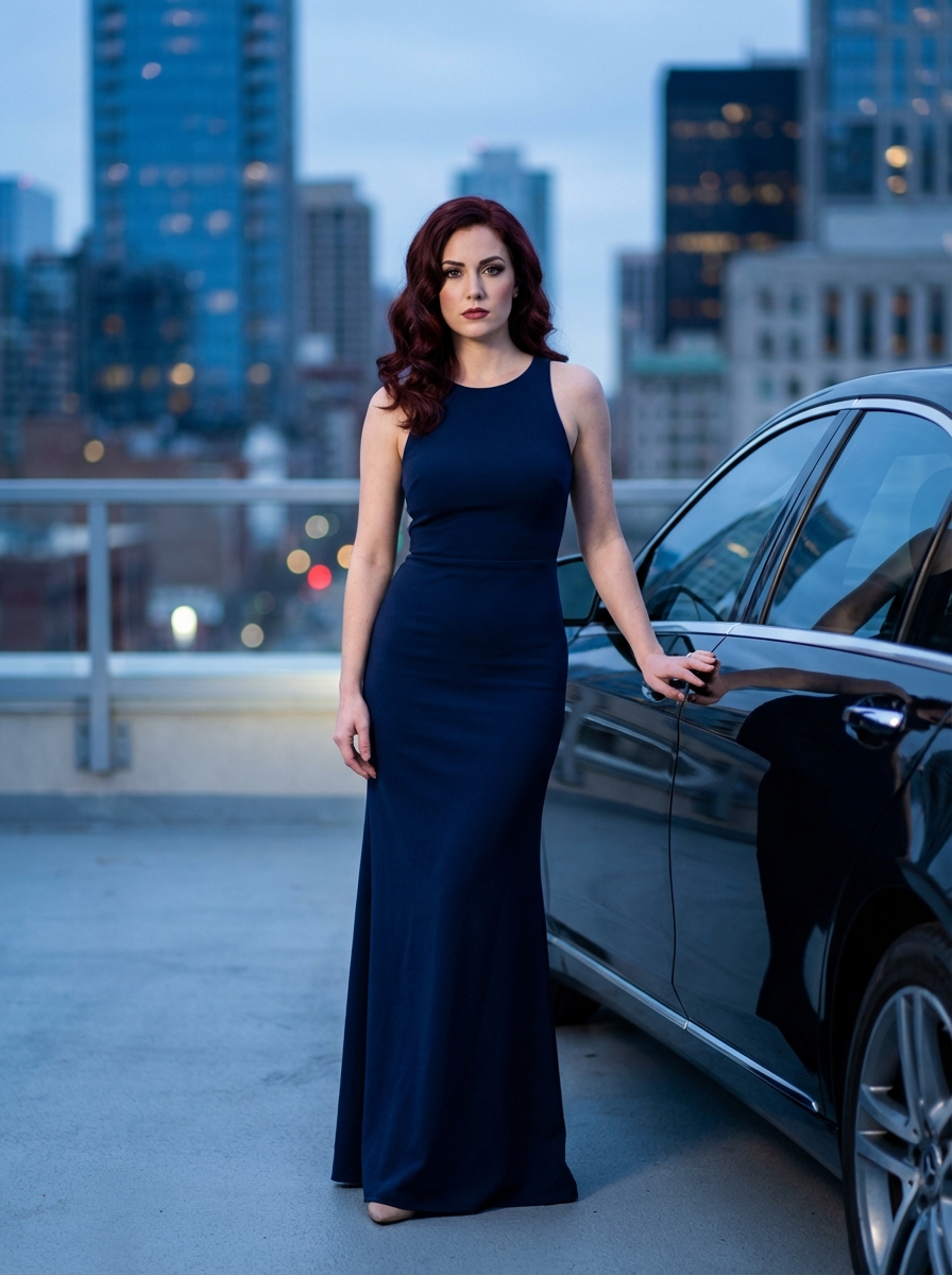 {"prompt_type": "image_generation", "style": ["photorealistic", "cinematic", "luxury fashion editorial", "high-end commercial photography"], "subject": {"gender": "model", "age_range": "mid 20s to early 30s", "pose": "standing confidently beside a luxury car, one hand resting on the car door", "expression": "serious, poised, confident", "body_type": "slim, elegant", "hair": {"color": "deep auburn", "style": "long, voluminous, soft waves, side-parted"}, if(gender=f){"makeup": {"style": "professional editorial makeup", "details": "defined eyes, subtle smoky eye} , natural lips, flawless skin"}, "wardrobe": {"dress": {"type": "evening gown ", "color": "deep navy blue", "fabric": "flowing satin or chiffon", "design": "sleeveless, V-neckline, fitted waist, long flowing skirt "}, "accessories": "minimal or none"}}, "vehicle": {"type": "luxury sedan", hair, "details": ["chrome grille", "round LED headlights", "high-end premium design"]}, "environment": {"location": "rooftop parking or elevated terrace", "cityscape": "modern metropolitan skyline with skyscrapers", "time_of_day": "blue hour, early night", "weather": "clear, calm"}, "lighting": {"primary": "soft cinematic key light illuminating the subject", "secondary": "ambient city lights in the background", "effects": ["subtle rim lighting", "soft shadows", "balanced contrast"]}, "camera": {"shot_type": "full-body portrait", "angle": "eye-level", "lens": "85mm prime lens", "aperture": "f/1.8", "depth_of_field": "shallow, soft background bokeh", "resolution": "ultra high resolution, 8K"}, "composition": {"framing": "subject centered slightly right, car occupying left foreground", "focus": "sharp focus on subject, softly blurred background", "leading_elements": "car lines leading toward the subject"}, "mood": ["luxurious", "powerful", "elegant", "confident", "cinematic drama"], "color_palette": ["deep navy blue", "charcoal gray", "warm city lights", "soft skin tones"], "post_processing": {"style": "high-end editorial retouching", "details": ["clean skin retouch", "enhanced contrast", "soft highlights", "cinematic color grading"]}, "negative_prompt": ["cartoon", "anime", "illustration", "low resolution", "blurry", "overexposed", "oversaturated", "distorted anatomy", "extra limbs", "text", "watermark", "logo"]}