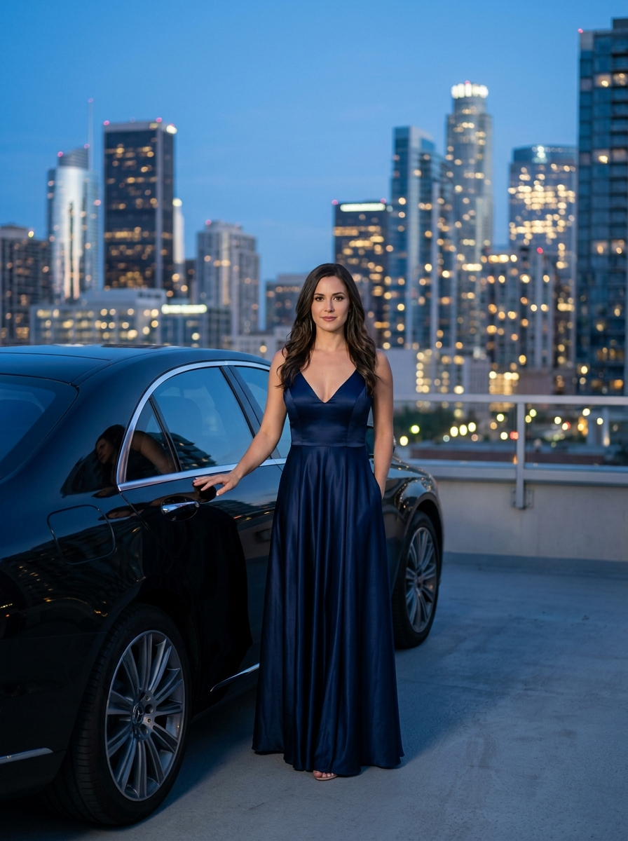 {"prompt_type": "image_generation", "style": ["photorealistic", "cinematic", "luxury fashion editorial", "high-end commercial photography"], "subject": {"gender": "model", "age_range": "mid 20s to early 30s", "pose": "standing confidently beside a luxury car, one hand resting on the car door", "expression": "serious, poised, confident", "body_type": "slim, elegant", "hair": {"color": "deep auburn", "style": "long, voluminous, soft waves, side-parted"}, if(gender=f){"makeup": {"style": "professional editorial makeup", "details": "defined eyes, subtle smoky eye} , natural lips, flawless skin"}, "wardrobe": {"dress": {"type": "evening gown ", "color": "deep navy blue", "fabric": "flowing satin or chiffon", "design": "sleeveless, V-neckline, fitted waist, long flowing skirt "}, "accessories": "minimal or none"}}, "vehicle": {"type": "luxury sedan", hair, "details": ["chrome grille", "round LED headlights", "high-end premium design"]}, "environment": {"location": "rooftop parking or elevated terrace", "cityscape": "modern metropolitan skyline with skyscrapers", "time_of_day": "blue hour, early night", "weather": "clear, calm"}, "lighting": {"primary": "soft cinematic key light illuminating the subject", "secondary": "ambient city lights in the background", "effects": ["subtle rim lighting", "soft shadows", "balanced contrast"]}, "camera": {"shot_type": "full-body portrait", "angle": "eye-level", "lens": "85mm prime lens", "aperture": "f/1.8", "depth_of_field": "shallow, soft background bokeh", "resolution": "ultra high resolution, 8K"}, "composition": {"framing": "subject centered slightly right, car occupying left foreground", "focus": "sharp focus on subject, softly blurred background", "leading_elements": "car lines leading toward the subject"}, "mood": ["luxurious", "powerful", "elegant", "confident", "cinematic drama"], "color_palette": ["deep navy blue", "charcoal gray", "warm city lights", "soft skin tones"], "post_processing": {"style": "high-end editorial retouching", "details": ["clean skin retouch", "enhanced contrast", "soft highlights", "cinematic color grading"]}, "negative_prompt": ["cartoon", "anime", "illustration", "low resolution", "blurry", "overexposed", "oversaturated", "distorted anatomy", "extra limbs", "text", "watermark", "logo"]}