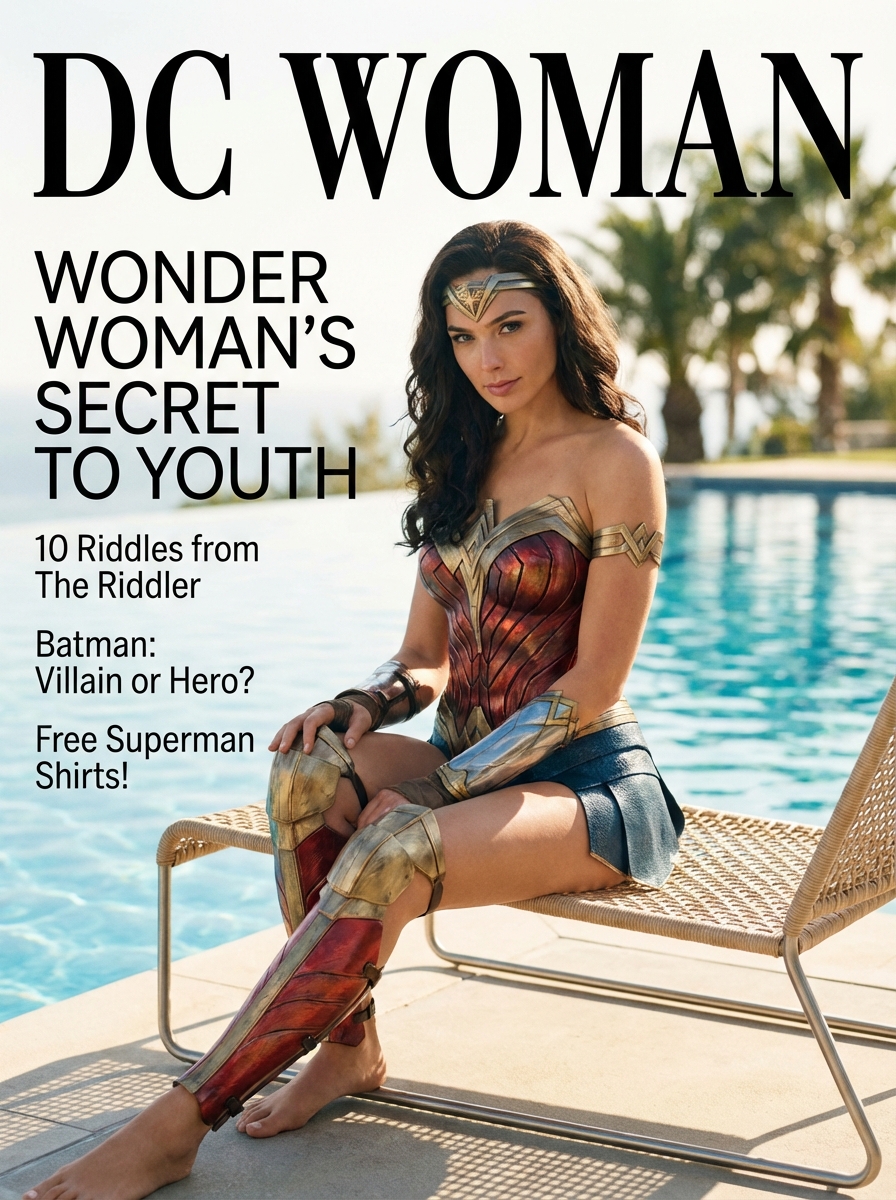 {"prompt_type": "magazine_cover", "magazine_title": "DC model", "cover_subject": {"actor": "Gal Gadot", "portrayal": "Wonder model", "pose": "sitting confidently on a modern pool chair", "wardrobe": "iconic Wonder model costume, pristine and cinematic", "expression": "calm, powerful, and radiant confidence", "attractiveness_notes": "balanced facial symmetry, expressive eyes, elegant posture, flattering natural makeup"}, "scene": {"location": "luxury outdoor pool", "environment": "sunlit poolside with shimmering blue water", "time_of_day": "golden afternoon", "weather": "clear sky, warm light"}, "composition": {"framing": "medium-full body portrait", "camera_angle": "eye-level, slightly angled for elegance", "lens": "50mm cinematic portrait lens", "depth_of_field": "shallow, soft background blur", "focus": "sharp focus on subject"}, "lighting": {"type": "natural sunlight with soft fill", "direction": "side-lit with gentle rim light", "mood": "warm, heroic, aspirational"}, "color_palette": {"primary": ["red", "blue", "gold"], "secondary": ["aqua blue", "sunlit white"], "tone": "vibrant yet polished magazine-grade color grading"}, "cover_text": {"main_headline": "Wonder model’s Secret to Youth", "subheadlines": ["10 Riddles from the RIDDLER", "Batman: Villain or Hero?", "FREE Superman Shirts!"]}, "typography": {"title_font": "bold modern serif", "headline_font": "clean high-contrast sans serif", "layout_style": "high-fashion editorial with balanced spacing"}, "quality": {"resolution": "8k", "detail_level": "ultra-detailed", "finish": "glossy premium magazine cover"}, "aspect_ratio": "3:4", "negative_prompt": ["blurry", "low resolution", "extra limbs", "distorted anatomy", "overexposed", "harsh shadows", "cartoon style", "watermarks", "text artifacts", "logo distortion"]}