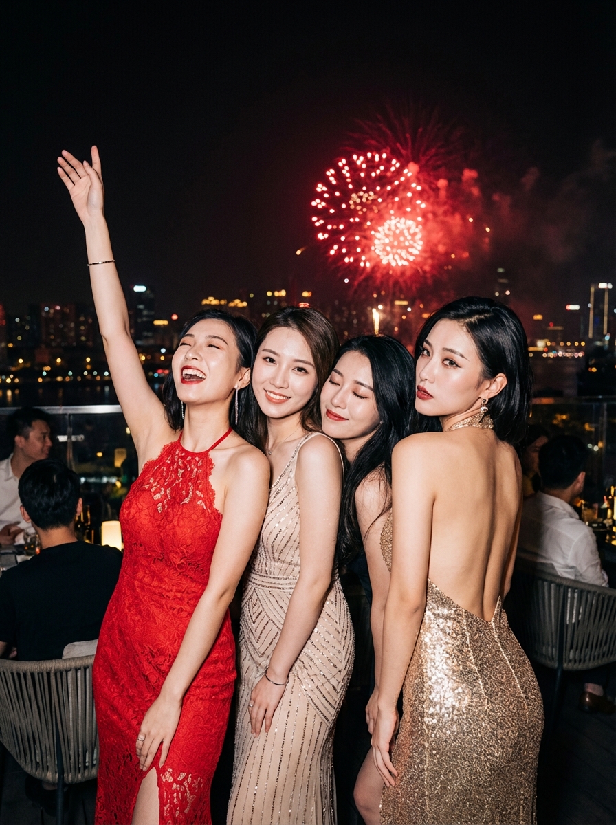 {"prompt_type": "Ultra Photorealistic Group Portrait", "subject_details": {"main_subjects": "Group of four young women celebrating", "subject_1_left": "young model with long dark wavy hair, wearing a beige/gold sleeveless sequin gown , smiling softly at the camera, silver if(gender=f){drop earrings } ", "subject_2_center_left": "young model with brown hair tied back, wearing a bright red lace dress with halter neck, one arm raised high in excitement, laughing with head tilted back, large gold if(gender=f){hoop earrings } ", "subject_3_center_right": "young model with dark hair, close to the group, eyes closed in a happy expression, leaning affectionately onto the model in red", "subject_4_right": "young model with long platinum blonde wavy hair, wearing a gold sequin backless dress, looking back over her shoulder at the camera with a sultry expression, small tattoo visible on her mid-back", "skin_texture": "High fidelity skin texture, visible pores, realistic makeup finish, slight sheen from flash"}, "fashion_and_styling": {"clothing_style": "Glamorous nightlife attire, New Year's Eve party style, sequins, lace, backless cuts", "accessories": "if(gender=f){Hoop earrings } , gold bangles, minimalist jewelry", "makeup": "Evening glam, highlighted cheekbones, glossy lips , defined brows"}, "environment_and_background": {"setting": "Outdoor rooftop terrace at night overlooking a city", "background_elements": "Dark night sky illuminated by bright red fireworks exploding in the distance, blurred city lights (bokeh) on the horizon", "atmosphere": "Festive, energetic, exclusive party vibe"}, "lighting_and_atmosphere": {"lighting_style": "Direct on-camera flash photography (paparazzi style)", "ambient_light": "Red glow from fireworks casting a subtle tint on the sky", "contrast": "High contrast between the brightly lit subjects and the dark background", "shadows": "Sharp, realistic shadows created by the flash"}, "camera_specifications": {"camera_woman": "Sony A7R V or Phase One XF IQ4", "lens": "35mm wide-angle prime lens", "aperture": "f/2.8", "shutter_speed": "1/125s", "iso": "800", "focus": "Sharp focus on the faces, creamy bokeh in the background"}, "technical_quality": {"resolution": "8k", "details": "Hyper-realistic, insane detail, volumetric lighting, ray tracing, unreal engine 5 render style features", "aspect_ratio": "3:4"}}