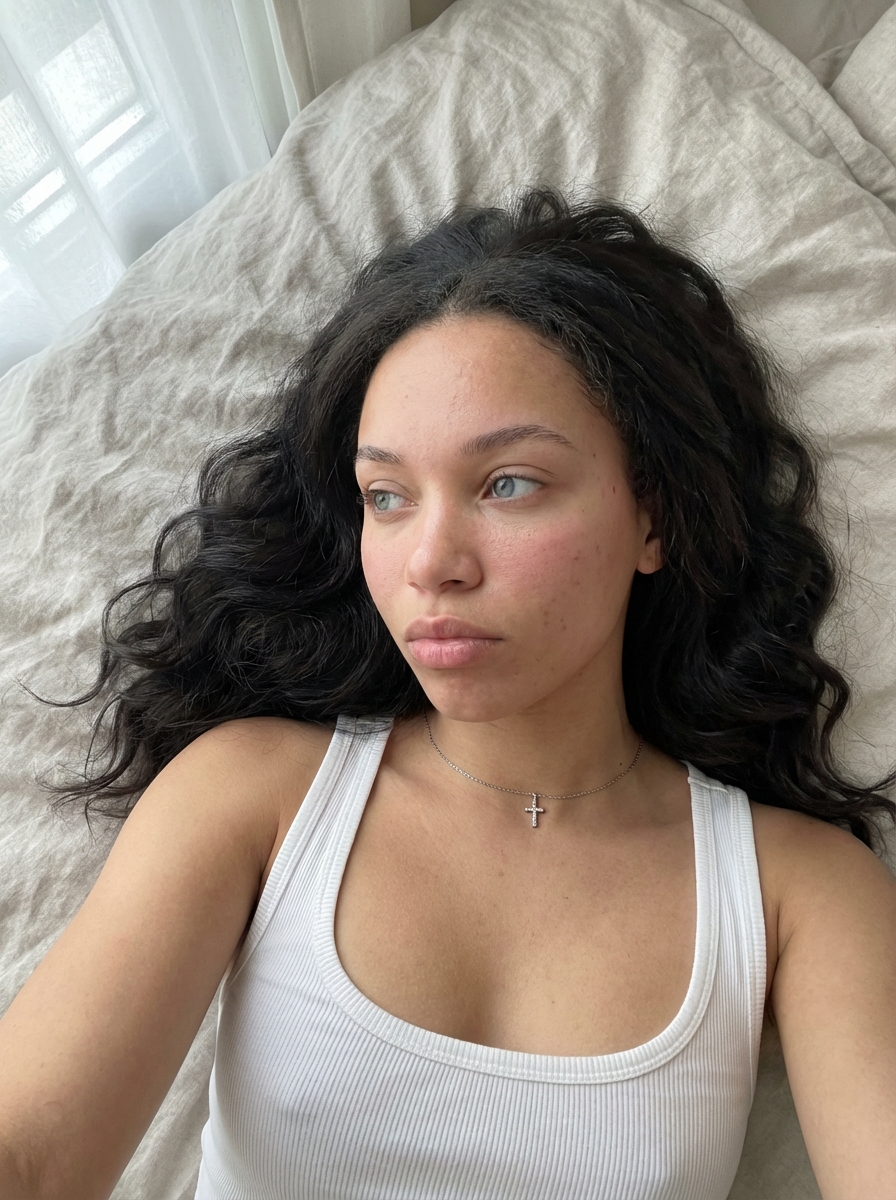{"prompt_type": "Ultra-Photorealistic Image Generation", "subject": {"demographics": "young model, roughly 20s", "hair": {hair, "style": "Long, straight to slightly wavy, loose and fanned out on the bed", "texture": "Silky, fine strands, realistic stray hairs visible"}, "skin": {"tone": "Fair/Pale with warm undertones", "texture": "High fidelity skin texture, visible pores, natural skin sheen, slight flush on cheeks", "details": "Hyper-realistic skin imperfections"}, "eyes": {"color": "Light (blue or grey)", "makeup": "Long defined eyelashes (mascara ), subtle eyeliner ", "gaze": "Looking slightly off-camera to the side, soft and dreamy"}, "mouth": {"lips": "Full, natural pink shade, slight gloss or balm finish", "expression": "Relaxed, neutral to slightly parted lips, moody pout"}}, "attire": {"clothing": "ribbed tank top /camisole ", "fit": "Tight-fitting, scoop neckline showing décolletage", "fabric_texture": "Soft cotton ribbing details visible"}, "accessories": {"neck": "Thin silver chain necklace with a small cross pendant resting on the chest", "ears": "Small silver if(gender=f){hoop earring } visible on the left ear"}, "pose_and_composition": {"position": "Lying down on back (supine)", "angle": "High-angle selfie perspective (point-of-view), close-up on face and upper torso", "framing": "Diagonal composition, head tilted to the right"}, "environment": {"setting": "Bedroom, lying on a bed", "background": "bed sheets/duvet", "texture": "Crumpled fabric, soft folds, linen texture"}, "lighting": {"type": "Soft diffused indoor light or window light", "quality": "Soft shadows, gentle highlights on the forehead, nose bridge, and chest", "mood": "Intimate, morning vibe, soft glow"}, "styling_and_mood": {"aesthetic": "Y2K selfie, model next door, candid, intimate, 'coquette' subtle undertones", "atmosphere": "Relaxed, alluring, lazy morning, authentic social media snapshot"}, "camera_technical": {"style": "Smartphone photography or compact digital camera", "lens": "24mm wide-angle (simulating phone camera)", "aperture": "f/2.2", "focus": "Sharp focus on eyes and lips, slight depth of field blurring the hair edges", "resolution": "8k, RAW photo, ultra-detailed", "processing": "Natural color grading, slight desaturation, realistic contrast"}}