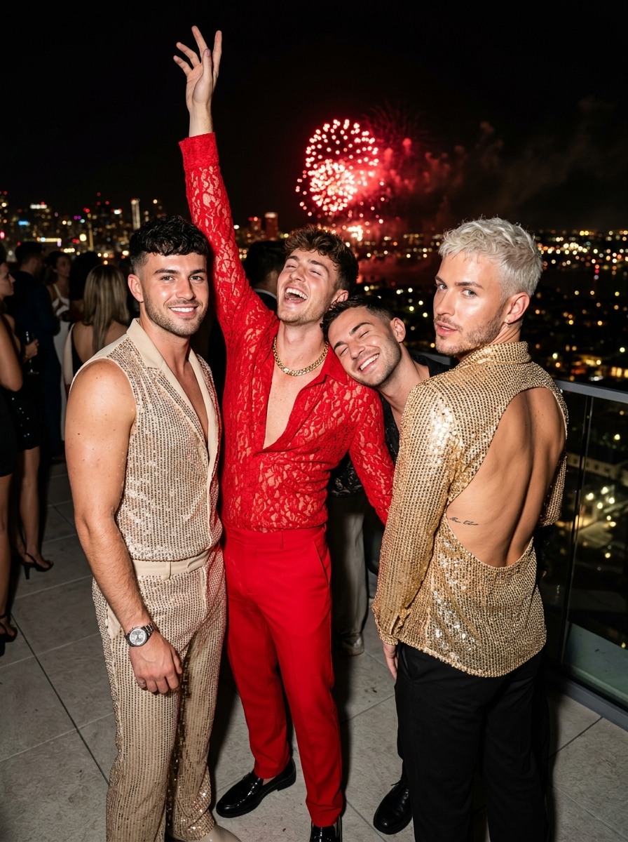 {"prompt_type":"Ultra Photorealistic Group Portrait","subject_details":{"main_subjects":"Group of four young men celebrating","subject_1_left":"young model with short dark textured hair, wearing a beige\/gold sleeveless sequin formal suit, smiling confidently at the camera, silver watch","subject_2_center_left":"young model with short brown tousled hair, wearing a bright red lace outfit with open collar, one arm raised high in excitement, laughing with head tilted back, large gold chain","subject_3_center_right":"young model with short dark hair, close to the group, eyes closed in a happy expression, leaning confidently onto the model in red","subject_4_right":"young model with short platinum blonde textured hair, wearing a gold sequin fitted open-back shirt, looking back over his shoulder at the camera with a confident expression, small tattoo on his mid-back","skin_texture":"High fidelity skin texture, pores, groomed skin finish with light stubble, slight sheen from flash"},"fashion_and_styling":{"clothing_style":"Glamorous nightlife attire, New Year's Eve party style, sequins, lace details, fitted cuts","accessories":"gold chains, watches, minimalist jewelry","makeup":"Evening groomed look, highlighted cheekbones, natural lips, defined brows"},"environment_and_background":{"setting":"Outdoor rooftop terrace at night overlooking a city","background_elements":"Dark night sky illuminated by bright red fireworks exploding in the distance, blurred city lights (bokeh) on the horizon","atmosphere":"Festive, energetic, exclusive party vibe"},"lighting_and_atmosphere":{"lighting_style":"Direct on-camera flash photography (paparazzi style)","ambient_light":"Red glow from fireworks casting a subtle tint on the sky","contrast":"High contrast between the brightly lit subjects and the dark background","shadows":"Sharp, realistic shadows created by the flash"},"camera_specifications":{"camera_man":"Sony A7R V or Phase One XF IQ4","lens":"35mm wide-angle prime lens","aperture":"f\/2.8","shutter_speed":"1\/125s","iso":"800","focus":"Sharp focus on the faces, creamy bokeh in the background"},"technical_quality":{"resolution":"8k","details":"Hyper-realistic, insane detail, volumetric lighting, ray tracing, unreal engine 5 render style features","aspect_ratio":"3:4"}}