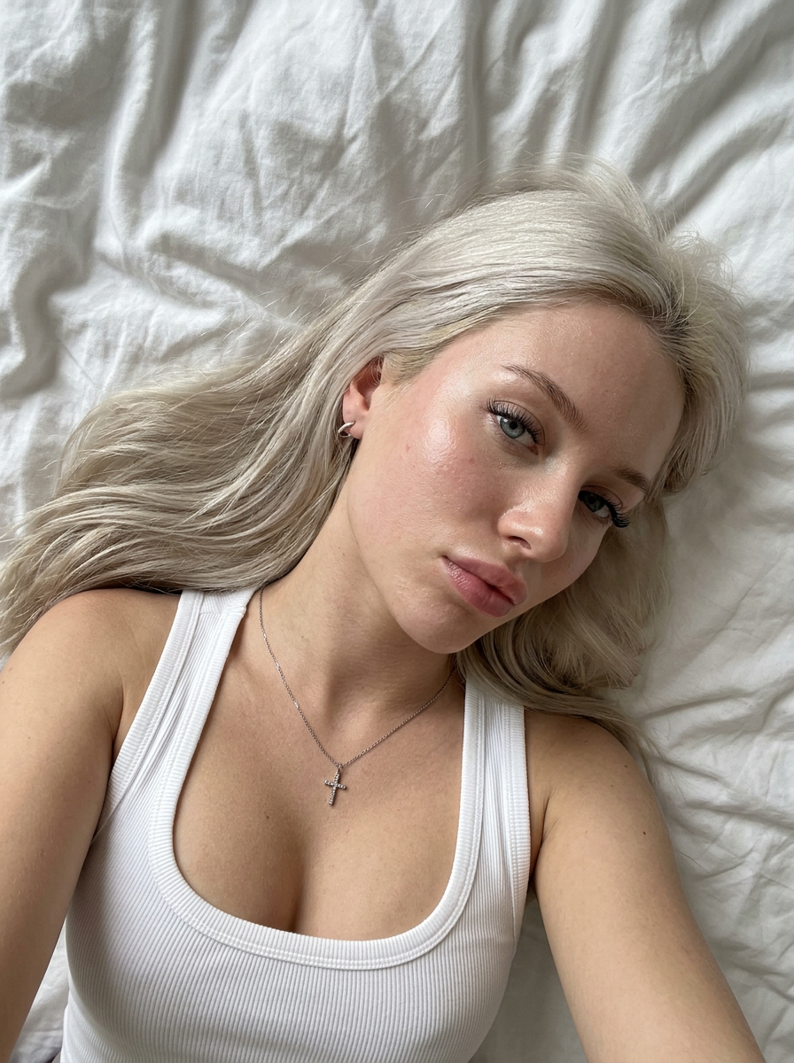 {"prompt_type":"Ultra-Photorealistic Image Generation","subject":{"demographics":"Young model, roughly 20s","hair":{"color":"Platinum blonde","style":"Long, straight to slightly wavy, loose and fanned out on the bed","texture":"Silky, fine strands, realistic stray hairs "},"skin":{"tone":"Fair\/Pale with warm undertones","texture":"High fidelity skin texture, pores, natural skin sheen, slight flush on cheeks","details":"Hyper-realistic skin imperfections"},"eyes":{"color":"Light (blue or grey)","makeup":"Long defined eyelashes (mascara), subtle eyeliner","gaze":"Looking slightly off-camera to the side, soft and dreamy"},"mouth":{"lips":"Full, natural pink shade, slight gloss or balm finish","expression":"Relaxed, neutral to slightly parted lips, moody pout"}},"attire":{"clothing":"White ribbed tank top\/camisole","fit":"Tight-fitting, scoop neckline showing d\u00e9colletage","fabric_texture":"Soft cotton ribbing details "},"accessories":{"neck":"Thin silver chain necklace with a small cross pendant resting on the chest","ears":"Small silver hoop earring on the left ear"},"pose_and_composition":{"position":"Lying down on back (supine)","angle":"High-angle selfie perspective (point-of-view), close-up on face and upper ","framing":"Diagonal composition, head tilted to the right"},"environment":{"setting":"Bedroom, lying on a bed","background":"White bed sheets\/duvet","texture":"Crumpled white fabric, soft folds, linen texture"},"lighting":{"type":"Soft diffused indoor light or window light","quality":"Soft shadows, gentle highlights on the forehead, nose bridge, and chest","mood":" , morning vibe, soft glow"},"styling_and_mood":{"aesthetic":"Y2K selfie, girl next door, candid, , 'coquette' subtle undertones","atmosphere":"Relaxed, alluring, lazy morning, authentic social media snapshot"},"camera_technical":{"style":"Smartphone photography or compact digital camera","lens":"24mm wide-angle (simulating phone camera)","aperture":"f\/2.2","focus":"Sharp focus on eyes and lips, slight depth of field blurring the hair edges","resolution":"8k, RAW photo, ultra-detailed","processing":"Natural color grading, slight desaturation, realistic contrast"}}