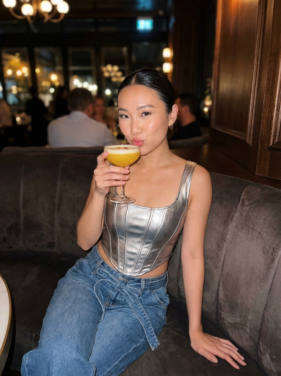 {"prompt": "Ultra photorealistic lifestyle portrait of a young model sitting inside a dimly lit upscale restaurant or cocktail bar. Scene is indoors at night. Subject is seated on a cushioned booth bench. Her legs are relaxed and slightly apart, feet planted on the floor, body posture confident and casual. Torso facing the camera directly. Camera angle is slightly above eye level, tilted downward about 10–15 degrees. Framing is medium-full body, from head to upper thighs. Subject occupies the center of the frame.\n\nHer right arm is raised and bent at the elbow, holding a coupe cocktail glass close to her face, glass tilted slightly toward the camera as if toasting. The cocktail is yellow-orange with a smooth foamy top. Fingers are elegantly wrapped around the stem of the glass. Left arm rests casually near her hip or on the bench.\n\nFacial expression is playful and confident with slightly puckered lips (soft pout). Head tilted subtly to the left. Eyes looking directly into the camera. Hair is slicked back tightly into a clean low bun with a precise center part, no loose strands.\n\nShe is wearing a metallic silver sleeveless corset-style top with vertical seam lines, structured fit, square neckline. Bottom is high-waisted loose blue jeans with a fabric tie detail at the waist. Outfit reflects soft ambient light with subtle sheen.\n\nJewelry is minimal: small if(gender=f){hoop earrings } , delicate thin necklace. Makeup is soft glam : natural skin texture visible, subtle blush , glossy lips , lightly contour ed cheeks, defined eyebrows, soft highlight on cheekbones.\n\nLighting is warm cinematic restaurant lighting. Key light is soft and frontal-left, simulating ambient bar lighting. Fill light is minimal, preserving natural shadows. Subtle rim light from behind creates gentle separation from background. No harsh flash. Skin highlights are smooth and realistic.\n\nBackground is softly blurred (shallow depth of field) with indistinct figures of other people sitting and standing behind her, warm bokeh lights, dark wood and glass textures. Atmosphere feels intimate, stylish, and social.\n\nPhotography style: ultra realistic, DSLR quality, natural proportions, accurate skin tones, high detail. No stylization, no illustration look.\n\nNegative constraints: no text, no subtitles, no captions, no logos, no watermarks, no social media UI, no advertisements, no filters, no beauty distortion, no over-smoothing.", "camera": {"lens": "35mm", "aperture": "f/1.8", "focus": "sharp focus on subject, shallow depth of field", "sensor": "full-frame DSLR look"}, "lighting": {"style": "warm cinematic indoor lighting", "key_light": "soft ambient light from front-left", "fill_light": "very subtle", "rim_light": "soft back separation light", "mood": "intimate, stylish, evening atmosphere"}, "composition": {"framing": "medium-full body", "angle": "slightly top-down", "subject_position": "centered", "orientation": "vertical portrait"}, "aspect ratio": "2:3"}