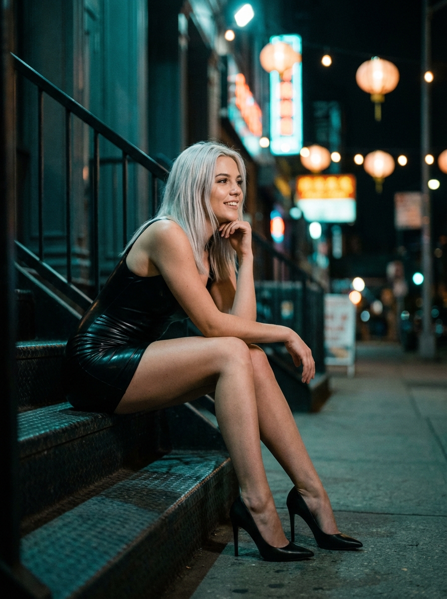 {"prompt": "Ultra-realistic cinematic portrait of a beautiful young with platinum hair and an athletic full hourglass figure , sitting casually on outdoor metal stairs at night, inspired by urban street photography. Same face and body style as the reference image, soft natural makeup, shoulder-length wavy platinum hair. She is sitting one step higher than usual, leaning forward slightly with elbows resting on her knees, relaxed confident expression, eyes looking off to the side. Outfit: latex dress, stilettos , subtle street-style vibe. Background: glowing lanterns and soft neon signs in the distance, shallow depth of field, gentle bokeh, moody teal-orange lighting. Shot with a fast prime lens, cinematic composition, realistic skin texture, soft shadows, natural highlights, sharp subject with blurred background, 4k, high detail, film look.", "negative_prompt": "collage, duplicated subject, cartoon, unrealistic proportions, blurry face, harsh lighting, overexposed, distorted hands, messy background, watermark, logo, text, low quality, oversaturated, extra limbs", "style": "cinematic portrait photography", "camera": "35mm, f1.8, natural low light", "aspect_ratio": "3:4", "quality": "high"}