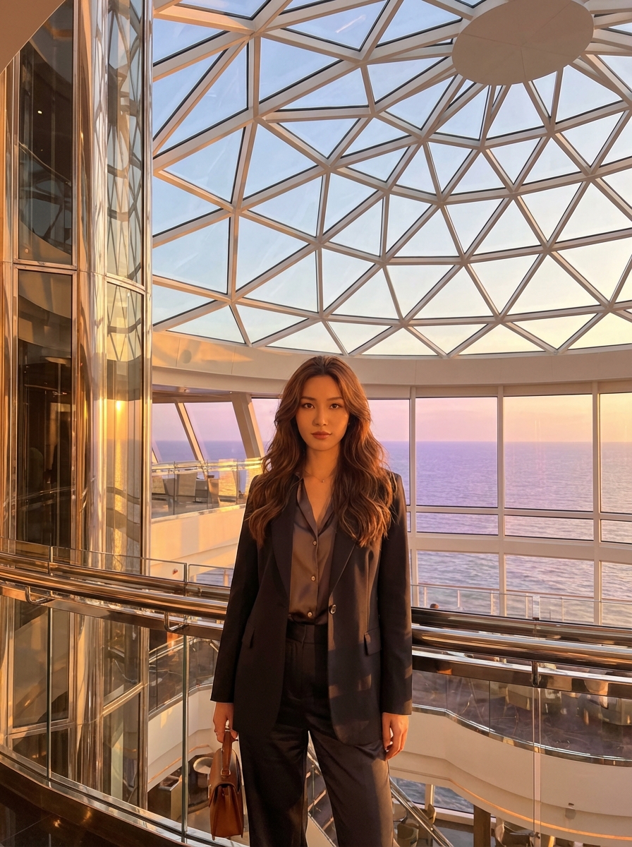{"prompt": "Ultra-realistic V6 realism portrait of an adult model with long wavy brown hair, sharp refined facial features, full natural lips, and flawless glowing skin. She is standing confidently in a luxurious futuristic cruise-ship atrium during golden hour. The space features an immense geometric glass dome ceiling composed of illuminated triangular panels, casting warm amber reflections across polished metallic surfaces. Through the dome, a serene ocean horizon is visible, washed in sunset tones of gold, pink, and soft violet. The atmosphere is elegant, cinematic, and high-end, with subtle depth-of-field, photorealistic lighting, intricate architectural details, and a premium fashion aesthetic.", "style": "V6 realism, ultra-photorealistic, high dynamic range, cinematic golden-hour lighting, premium editorial photography", "camera": {"type": "full-frame DSLR", "lens": "85mm portrait lens", "aperture": "f/1.8", "focus": "sharp focus on subject, soft bokeh background", "perspective": "eye-level, slightly forward angle"}, "environment": {"location": "luxury futuristic cruise-ship atrium", "lighting": "warm sunset light filtered through geometric glass dome", "details": ["triangular glass ceiling panels", "reflections on polished metal surfaces", "soft atmospheric glow", "ocean horizon visible outside"]}, "subject": {"age": "mid-20s (adult)", "gender": "model", "expression": "confident and poised", "hair": "long, wavy, rich brown color", "skin": "flawless natural texture", "pose": "standing confidently with relaxed, elegant posture"}}