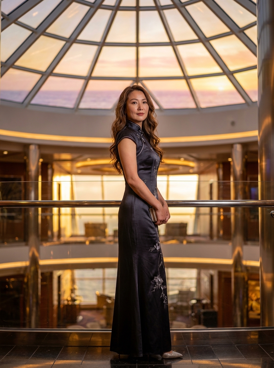 {"prompt": "Ultra-realistic V6 realism portrait of an adult model with long wavy brown hair, sharp refined facial features, full natural lips, and flawless glowing skin. She is standing confidently in a luxurious futuristic cruise-ship atrium during golden hour. The space features an immense geometric glass dome ceiling composed of illuminated triangular panels, casting warm amber reflections across polished metallic surfaces. Through the dome, a serene ocean horizon is visible, washed in sunset tones of gold, pink, and soft violet. The atmosphere is elegant, cinematic, and high-end, with subtle depth-of-field, photorealistic lighting, intricate architectural details, and a premium fashion aesthetic.", "style": "V6 realism, ultra-photorealistic, high dynamic range, cinematic golden-hour lighting, premium editorial photography", "camera": {"type": "full-frame DSLR", "lens": "85mm portrait lens", "aperture": "f/1.8", "focus": "sharp focus on subject, soft bokeh background", "perspective": "eye-level, slightly forward angle"}, "environment": {"location": "luxury futuristic cruise-ship atrium", "lighting": "warm sunset light filtered through geometric glass dome", "details": ["triangular glass ceiling panels", "reflections on polished metal surfaces", "soft atmospheric glow", "ocean horizon visible outside"]}, "subject": {"age": "mid-20s (adult)", "gender": "model", "expression": "confident and poised", "hair": "long, wavy, rich brown color", "skin": "flawless natural texture", "pose": "standing confidently with relaxed, elegant posture"}}