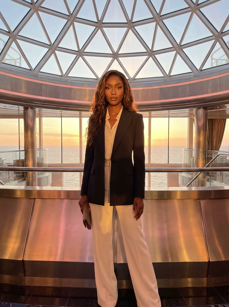 {"prompt": "Ultra-realistic V6 realism portrait of an adult model with long wavy brown hair, sharp refined facial features, full natural lips, and flawless glowing skin. She is standing confidently in a luxurious futuristic cruise-ship atrium during golden hour. The space features an immense geometric glass dome ceiling composed of illuminated triangular panels, casting warm amber reflections across polished metallic surfaces. Through the dome, a serene ocean horizon is visible, washed in sunset tones of gold, pink, and soft violet. The atmosphere is elegant, cinematic, and high-end, with subtle depth-of-field, photorealistic lighting, intricate architectural details, and a premium fashion aesthetic.", "style": "V6 realism, ultra-photorealistic, high dynamic range, cinematic golden-hour lighting, premium editorial photography", "camera": {"type": "full-frame DSLR", "lens": "85mm portrait lens", "aperture": "f/1.8", "focus": "sharp focus on subject, soft bokeh background", "perspective": "eye-level, slightly forward angle"}, "environment": {"location": "luxury futuristic cruise-ship atrium", "lighting": "warm sunset light filtered through geometric glass dome", "details": ["triangular glass ceiling panels", "reflections on polished metal surfaces", "soft atmospheric glow", "ocean horizon visible outside"]}, "subject": {"age": "mid-20s (adult)", "gender": "model", "expression": "confident and poised", "hair": "long, wavy, rich brown color", "skin": "flawless natural texture", "pose": "standing confidently with relaxed, elegant posture"}}