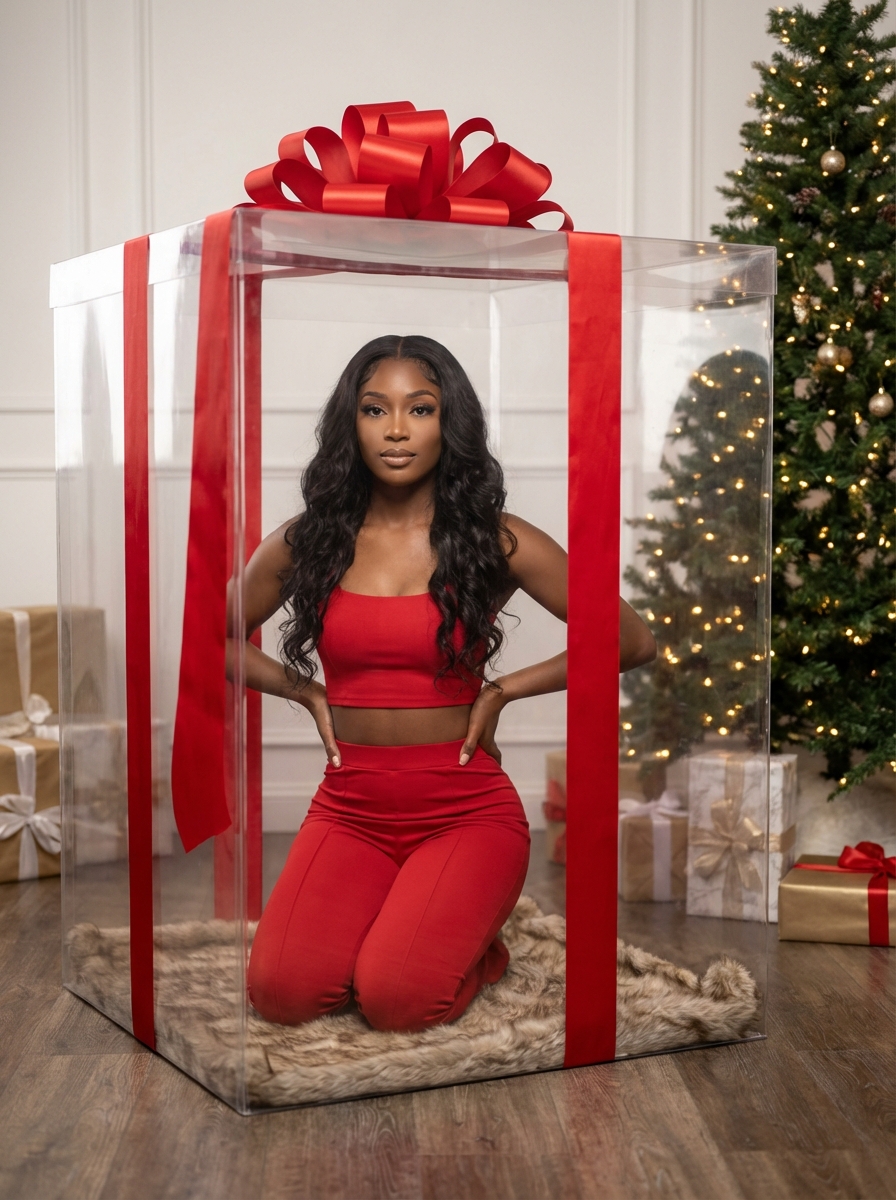 {"prompt": "Use facial features of the attached photo. A hyper-realistic, high-fashion holiday editorial photograph featuring one adult model, styled in a luxury gift-themed concept with a playful yet polished couture aesthetic.\n\nSubject:\nOne adult model with long, flowing, wavy hair, glossy and voluminous, cascading over her shoulders and down her back. Her makeup is refined and editorial: smooth luminous skin, softly contour ed cheeks, defined brows, subtle smoky eyes , long lashes , and a natural rose-toned lip. Her expression is calm, confident, and poised, looking directly toward the camera.\n\nWardrobe & Styling:\nShe wears a sleek two-piece fitted ensemble in a vibrant solid red tone, clean-lined and modern, emphasizing a fashion editorial look rather than costume styling. The outfit is minimal, structured, and elegant. No excessive accessories—styling remains refined and contemporary.\n\nPose & Composition:\nthe model kneels gracefully inside a large transparent gift box, hands resting confidently on her hips. Her posture is upright and composed, creating a strong sculptural silhouette. Full-body vertical composition with the subject centered and clearly framed by the box.\n\nEnvironment & Set Design:\nA festive indoor holiday setting styled like a luxury campaign set. The transparent gift box is wrapped with bold red satin ribbons and topped with an oversized red bow. A decorated Christmas tree stands beside the box, adorned with neutral metallic ornaments and soft warm lights. Wrapped gifts in coordinating colors are arranged neatly around the base. The floor is wooden with a plush faux-fur rug inside the box.\n\nLighting & Atmosphere:\nSoft, diffused studio lighting evenly illuminates the subject and environment. Highlights enhance skin texture, fabric smoothness, and the reflective surfaces of the gift box. Shadows are gentle and controlled, maintaining a clean, high-end editorial finish.\n\nColor Palette:\nRich red ribbons, clear acrylic tones, soft white, warm wood neutrals, subtle metallic accents, and natural skin tones.\n\nStyle Keywords:\nUltra-photorealistic, luxury holiday fashion editorial, studio photography, modern festive styling, high-detail realism, clean composition, no anime, no illustration, no CGI, no 3D render.\n\nAspect Ratio: 4:5 (Vertical)\n\nCamera: Full-frame DSLR or mirrorless\nLens: 50mm prime\nAperture: f/4\nShutter Speed: 1/160s\nISO: 100\nFocus: Sharp focus on subject with clean background clarity\nWhite Balance: Neutral studio daylight\nResolution: Ultra-high resolution with crisp detail in skin, fabric, and props", "aspect_ratio": "4:5", "style": "hyper-realistic photography", "negative_prompt": "costume, cartoon, anime, illustration, 3D render, CGI, blurry, low quality, deformed, extra limbs, accessories overload, text, watermark, overexposed, underexposed"}