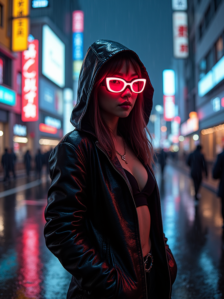 Rainy night in Shibuya, reflections of neon lights on the wet streets. Dark neon-lit outfit, glowing cyberpunk glasses. Cyberpunk realism.