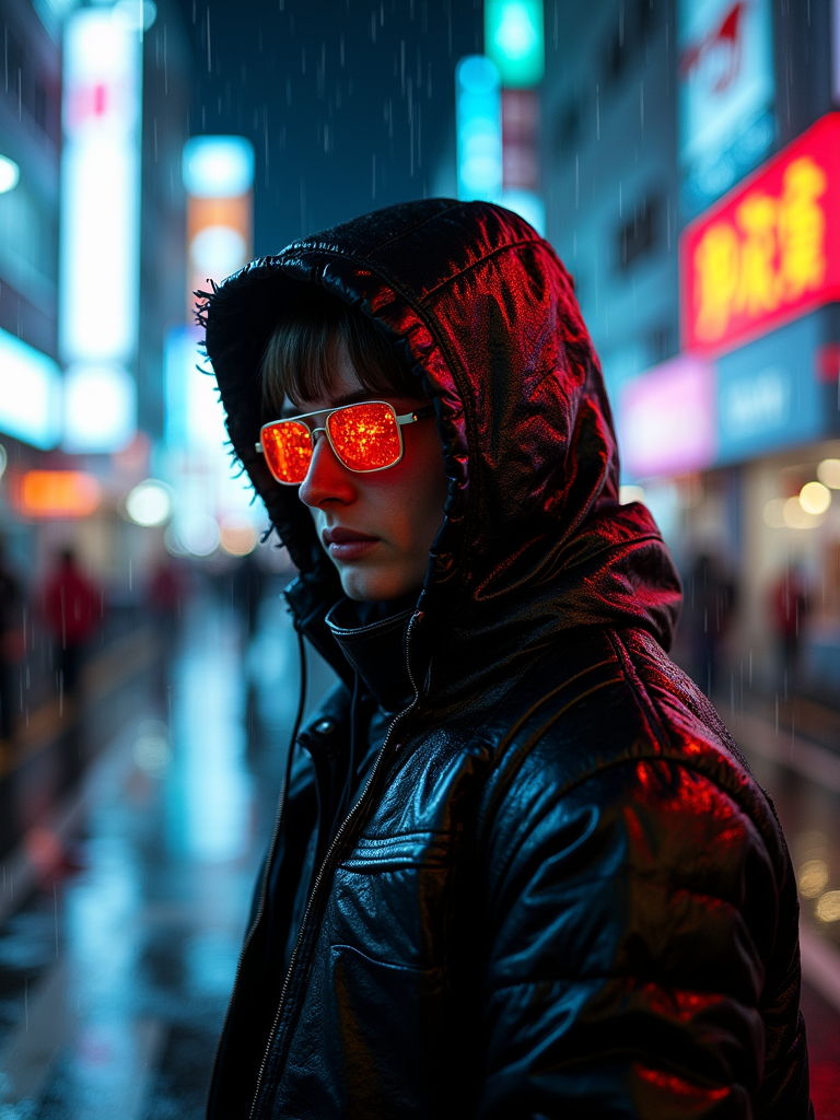 Rainy night in Shibuya, reflections of neon lights on the wet streets. Dark neon-lit outfit, glowing cyberpunk glasses. Cyberpunk realism.