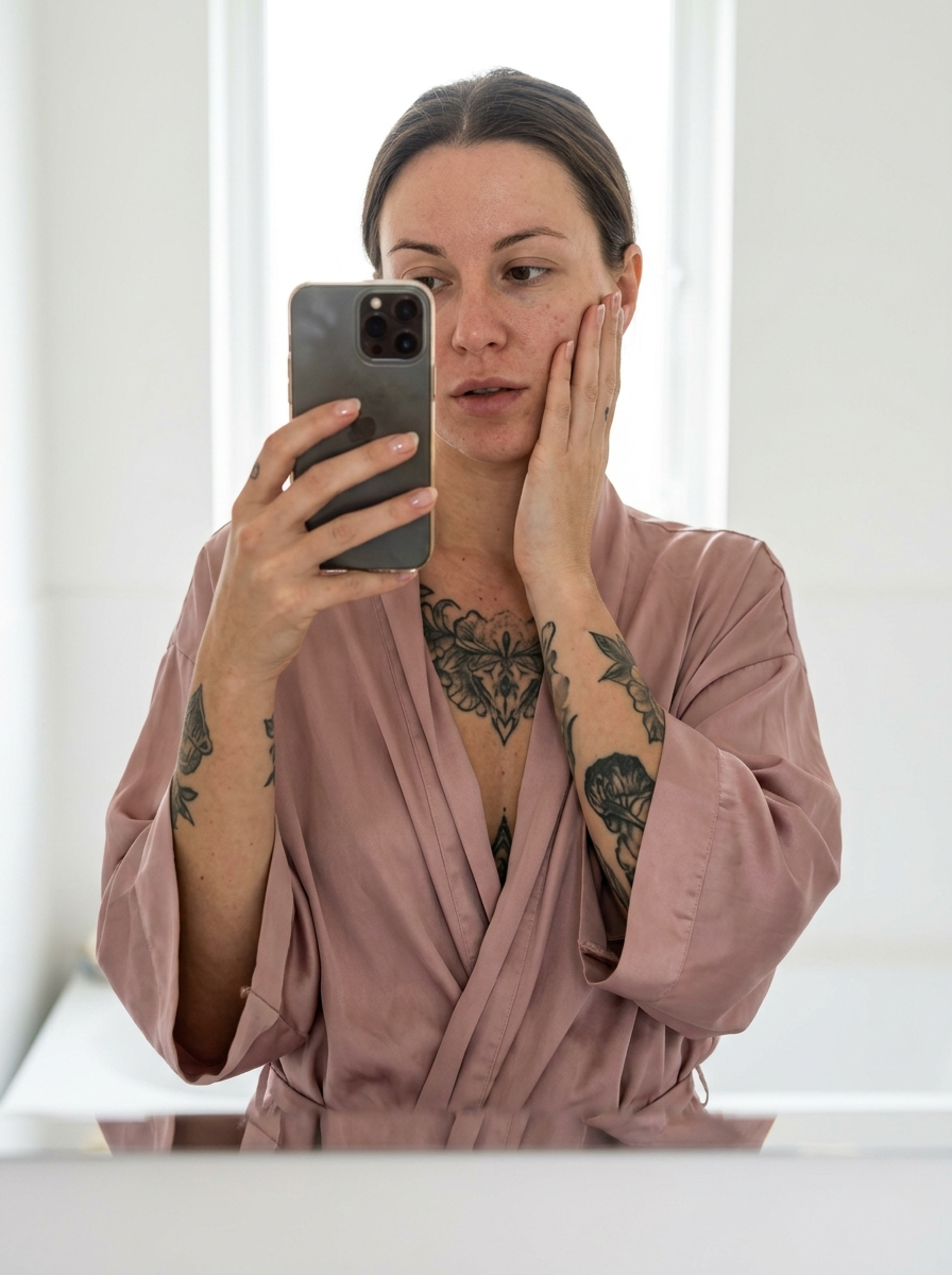 Raw, unposed mirror photograph with a documentary, candid feel. A model stands naturally in a bright white bathroom, captured mid-gesture, as if interrupted during a quiet morning moment. She wears a soft pink silk dressing gown, loosely draped, with natural folds and weight of real silk fabric — subtle sheen, micro-wrinkles, uneven light reflection. The contrast between the smooth silk robe and natural human skin is emphasized: realistic skin texture with pores, slightredness, soft tonal transitions, no airbrushing. Tattoos on her chest and arms appear authentic — real ink density, slight blur at the edges, embedded naturally into the skin rather than floating on top. She holds a smartphone in one hand, partially covering the face, while the other hand rests against her cheek in an instinctive, casual pose. Fingernails have a natural glossy finish with imperfections, not overly polished. The mirror reflection is optically correct, with subtle distortion, depth, and light falloff. Lighting is soft, natural, bathroom daylight — diffused highlights, gentle shadows, no harsh contrast. Neutral, restrained color palette dominated by whites and skin tones, with muted dusty-pink accents from the robe. Photographer’s perspective: 85mm full-frame look, shallow depth of field, realistic focus falloff, foreground and background separation feels optical, not artificial. Cinematic but grounded realism — feels like a real photo taken on a phone or mirror camera, not a styled shoot. Ultra-realistic photography, natural anatomy, authentic proportions, no stylization.