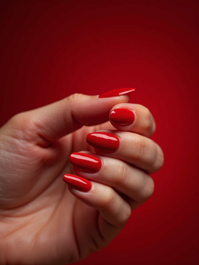 red velvet almond-shaped nails, beauty studio setting, rich red tones, soft bokeh background, posed fingers showcasing nail curve