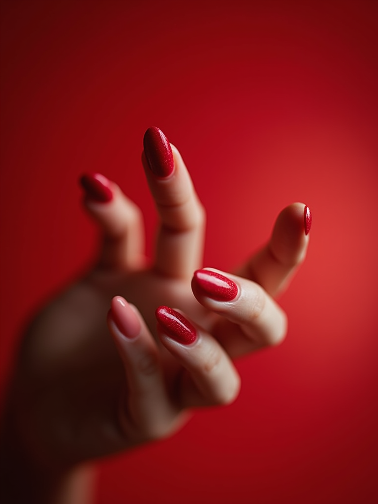 red velvet almond-shaped nails, beauty studio setting, rich red tones, soft bokeh background, posed fingers showcasing nail curve