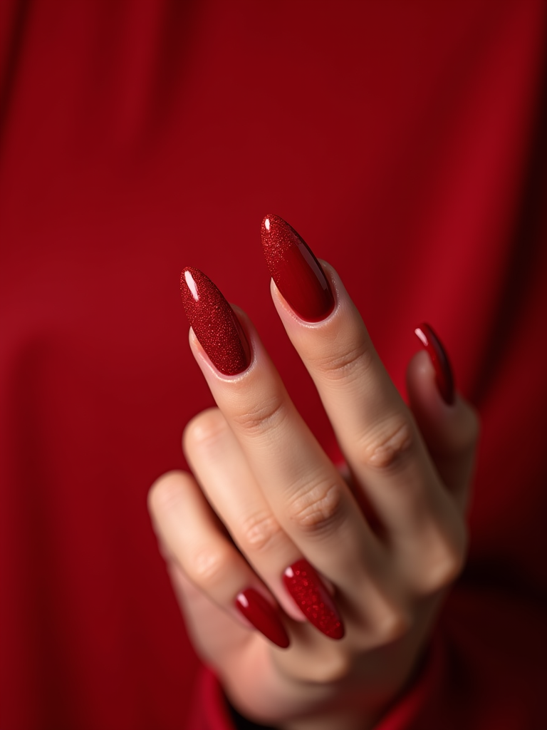 red velvet almond-shaped nails, beauty studio setting, rich red tones, soft bokeh background, posed fingers showcasing nail curve