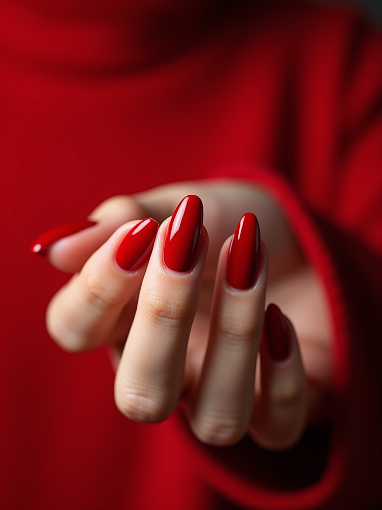 red velvet almond-shaped nails, beauty studio setting, rich red tones, soft bokeh background, posed fingers showcasing nail curve
