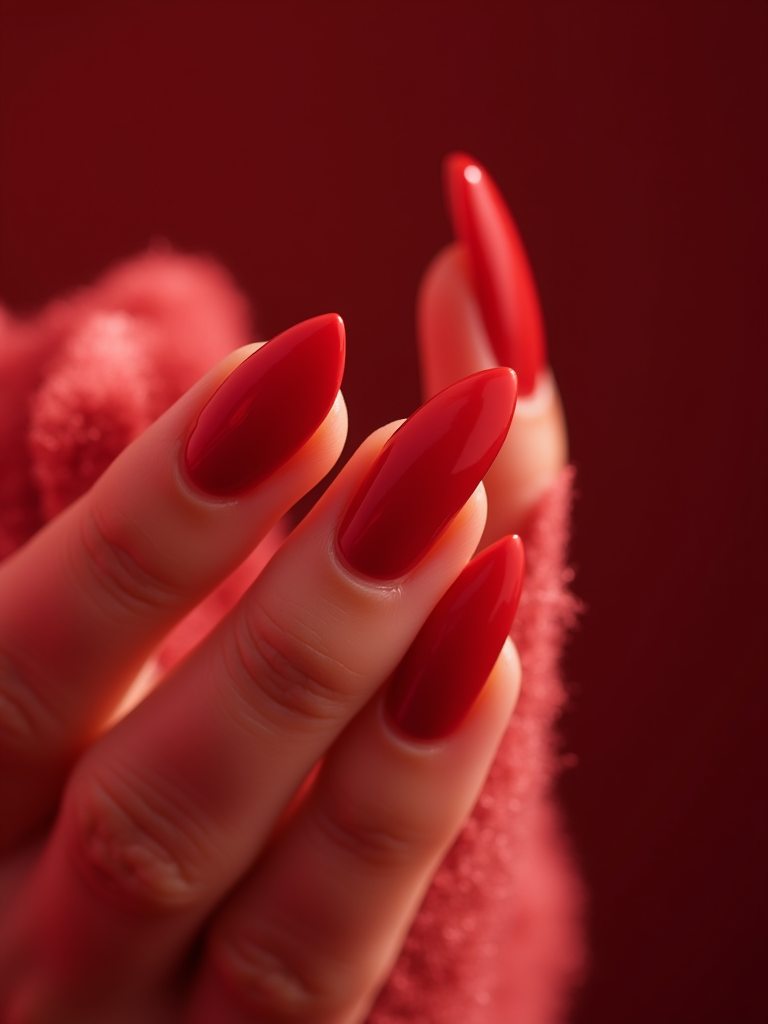 red velvet almond-shaped nails, beauty studio setting, rich red tones, soft bokeh background, posed fingers showcasing nail curve