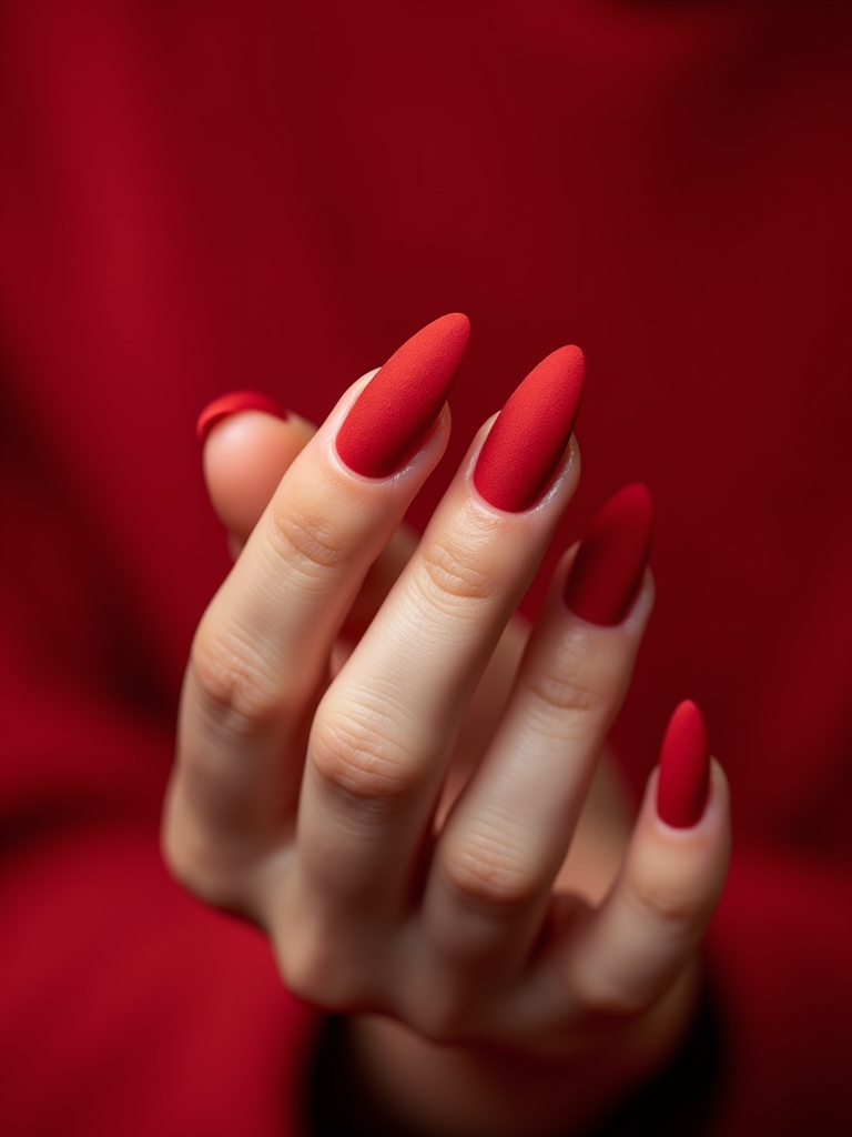 red velvet almond-shaped nails, beauty studio setting, rich red tones, soft bokeh background, posed fingers showcasing nail curve