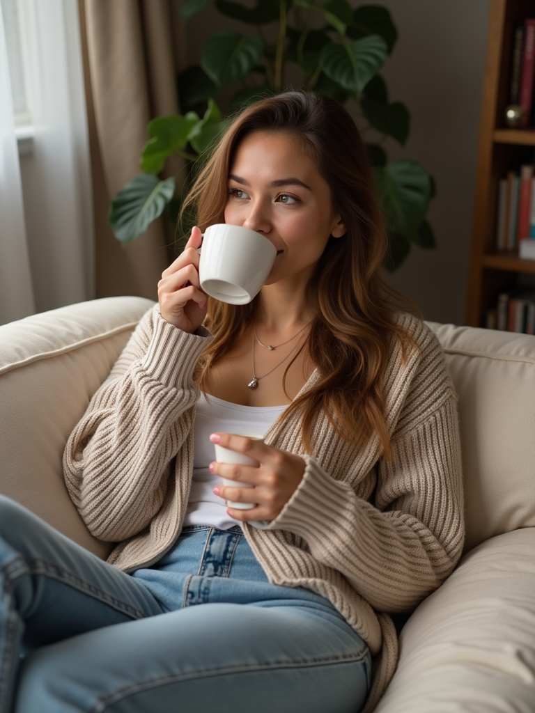 relatable feminine model lounging in casual clothes, sipping tea on a comfy couch
