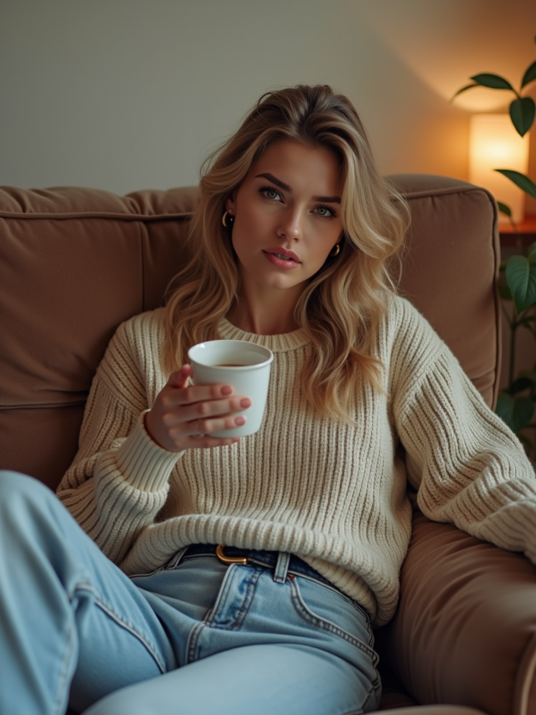 relatable feminine model lounging in casual clothes, sipping tea on a comfy couch