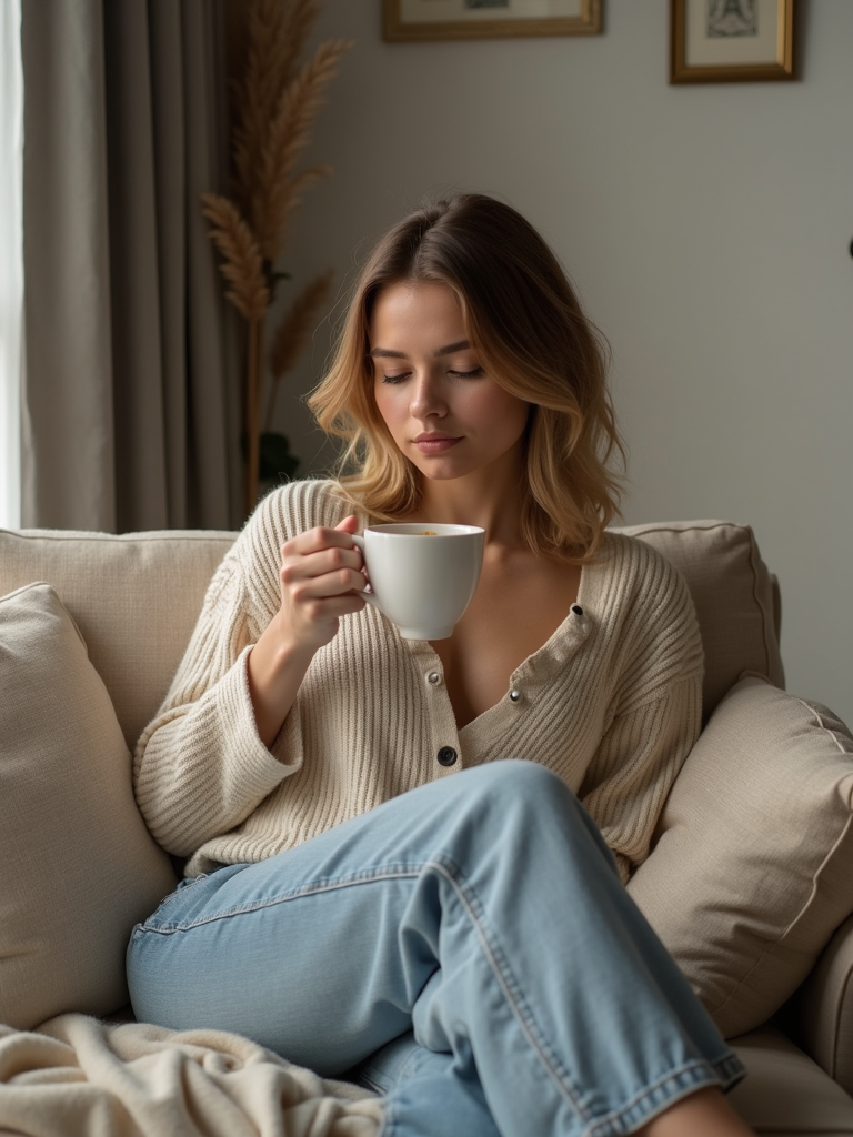 relatable feminine model lounging in casual clothes, sipping tea on a comfy couch
