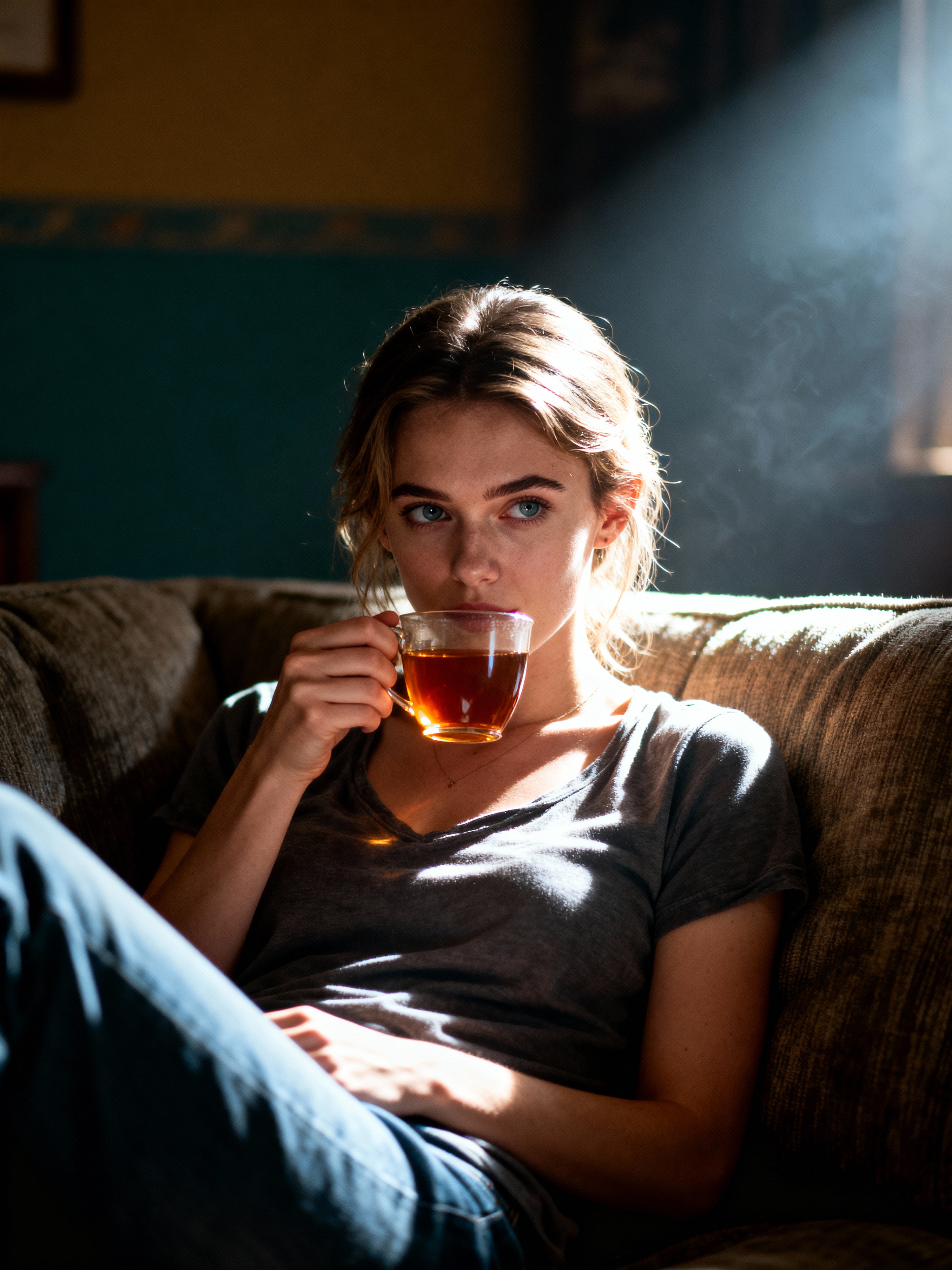 relatable feminine model lounging in casual clothes, sipping tea on a comfy couch