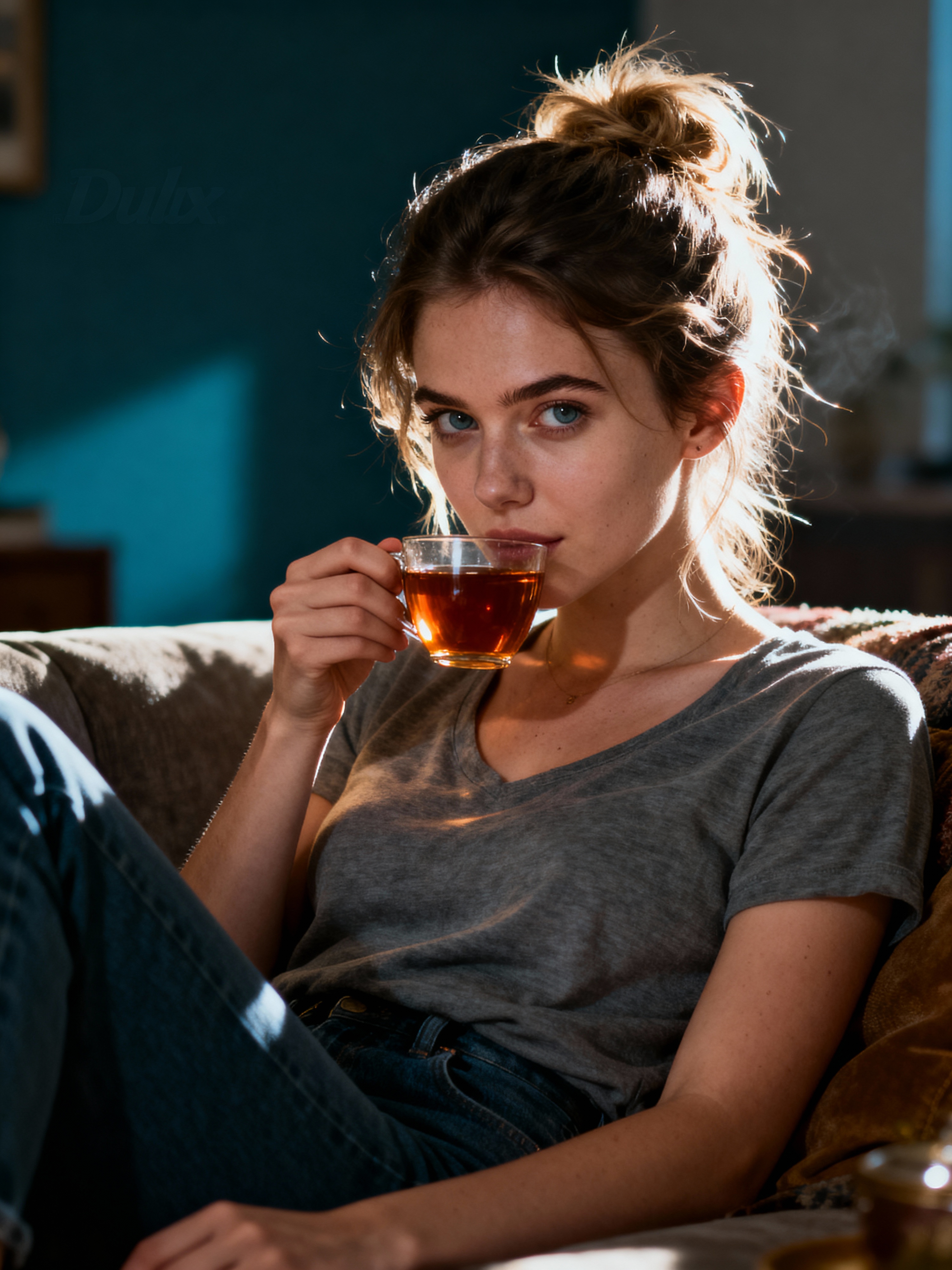 relatable feminine model lounging in casual clothes, sipping tea on a comfy couch