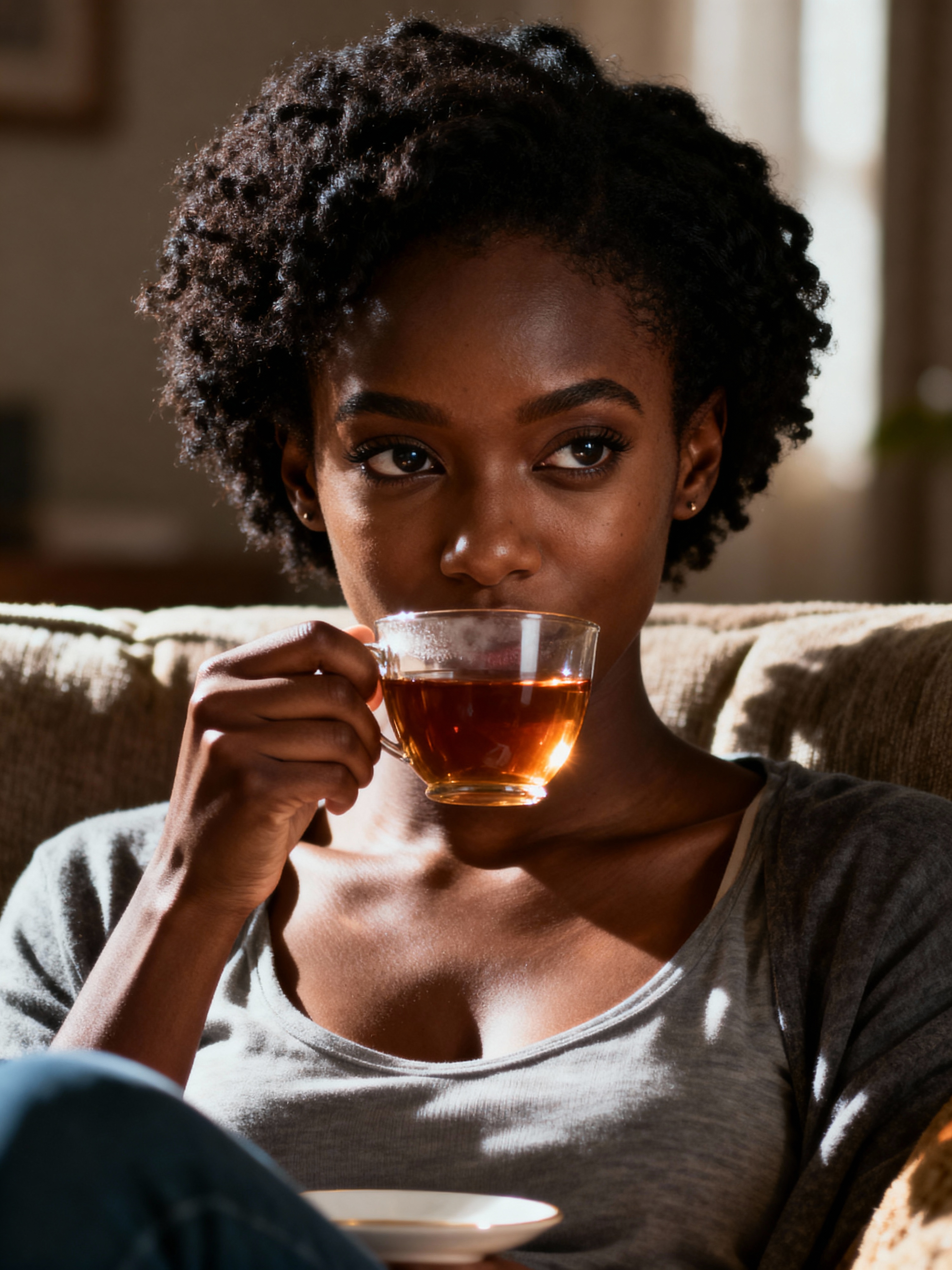 relatable feminine model lounging in casual clothes, sipping tea on a comfy couch