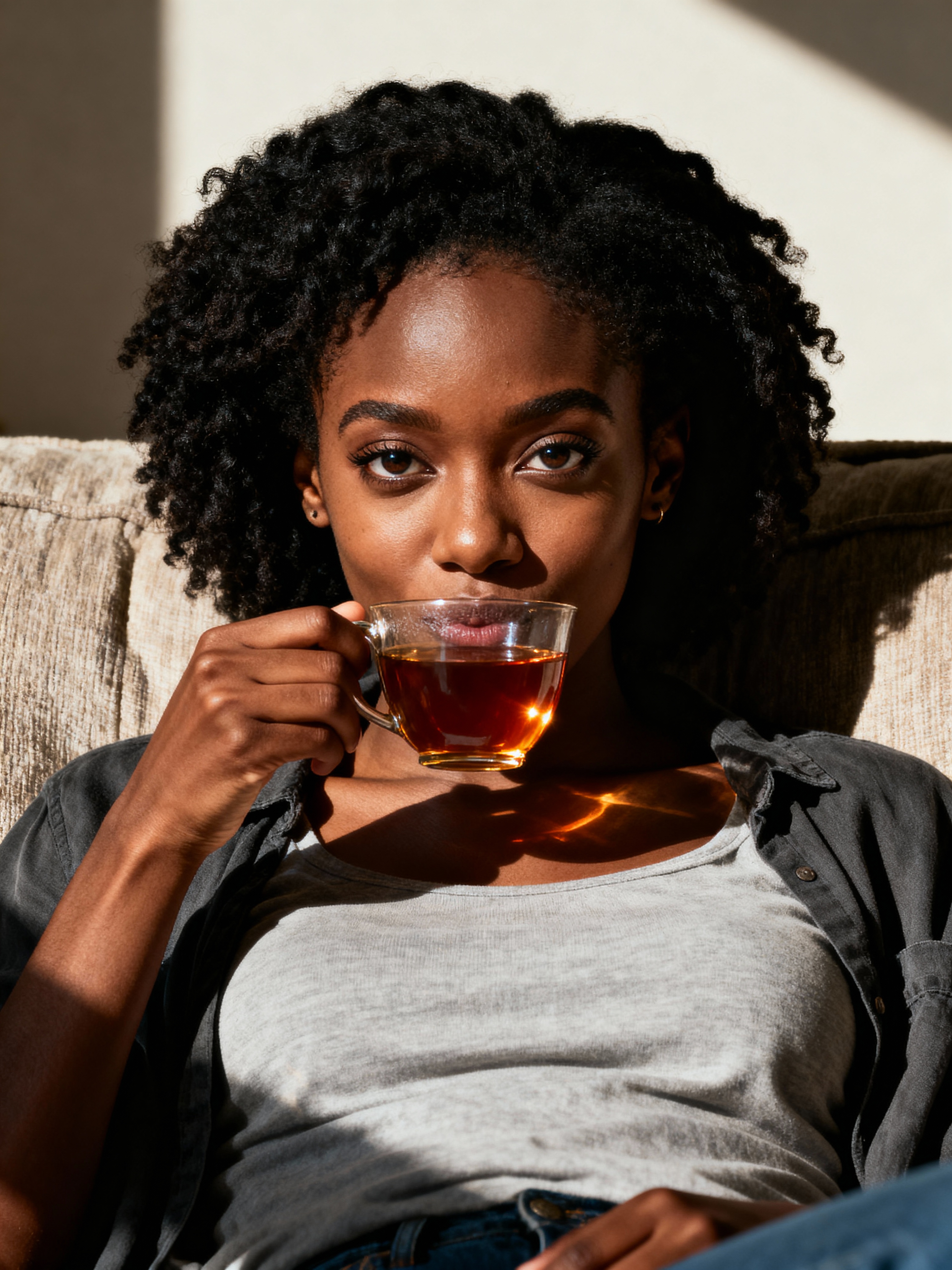 relatable feminine model lounging in casual clothes, sipping tea on a comfy couch