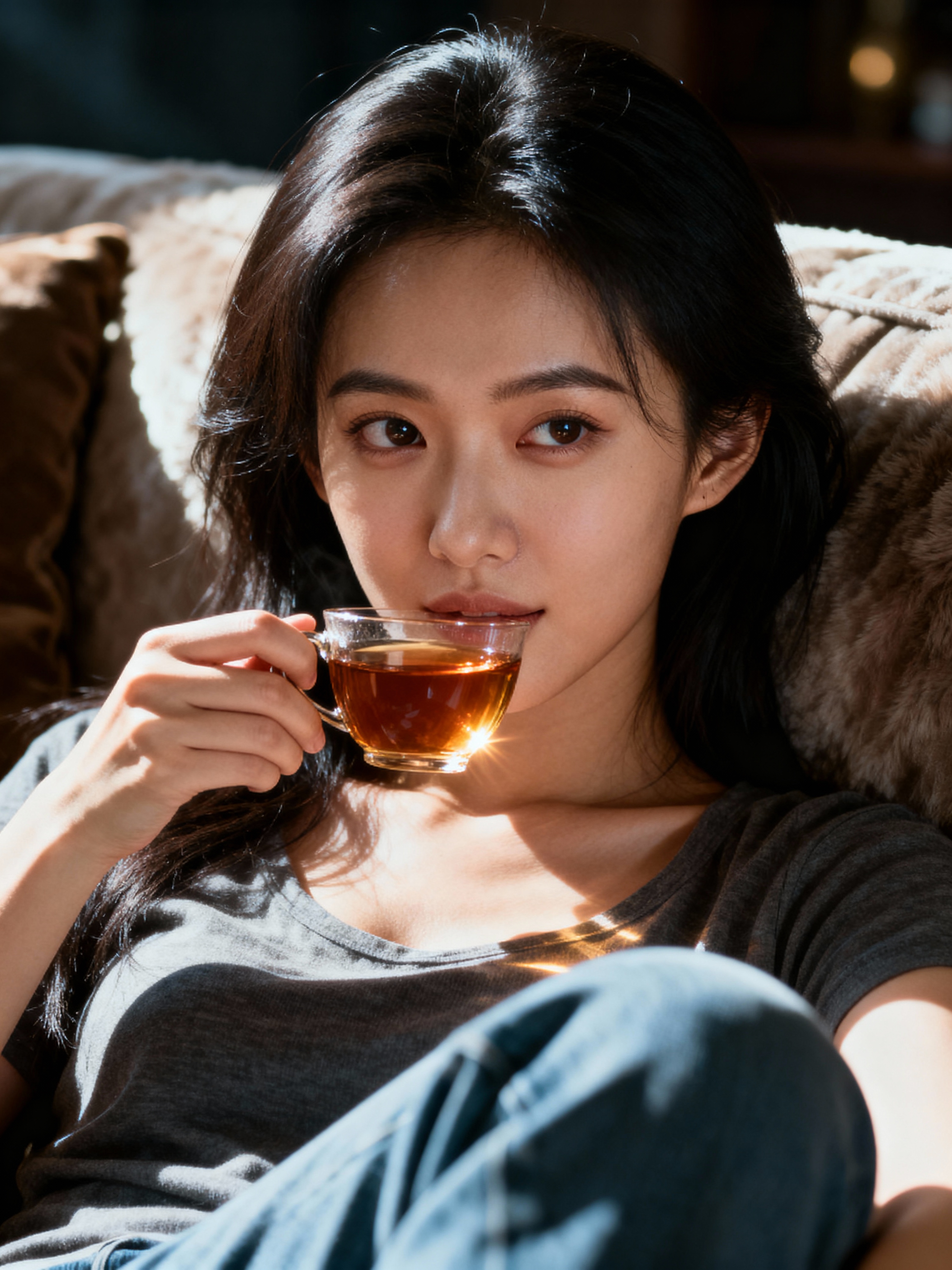 relatable feminine model lounging in casual clothes, sipping tea on a comfy couch