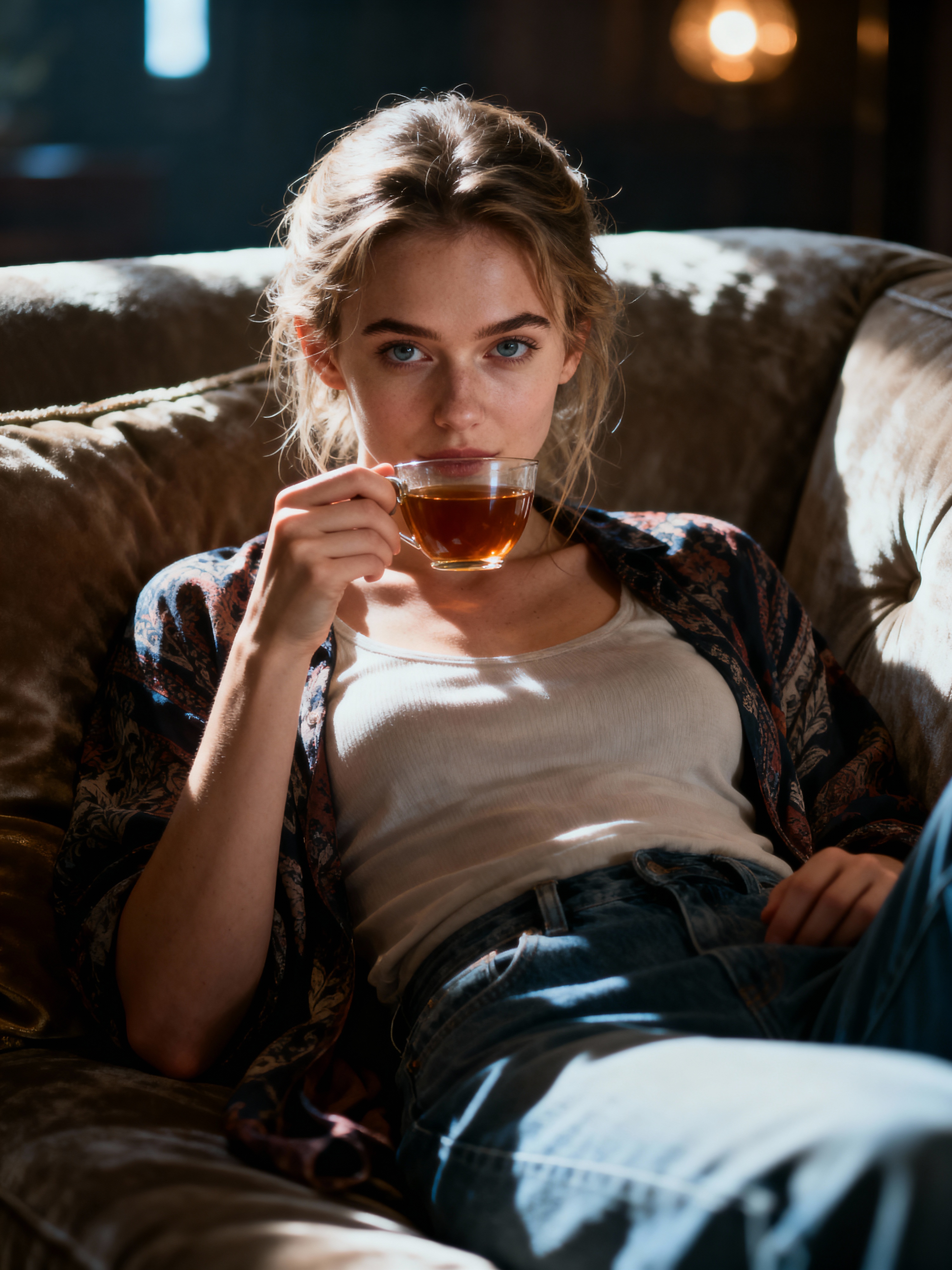 relatable feminine model lounging in casual clothes, sipping tea on a comfy couch