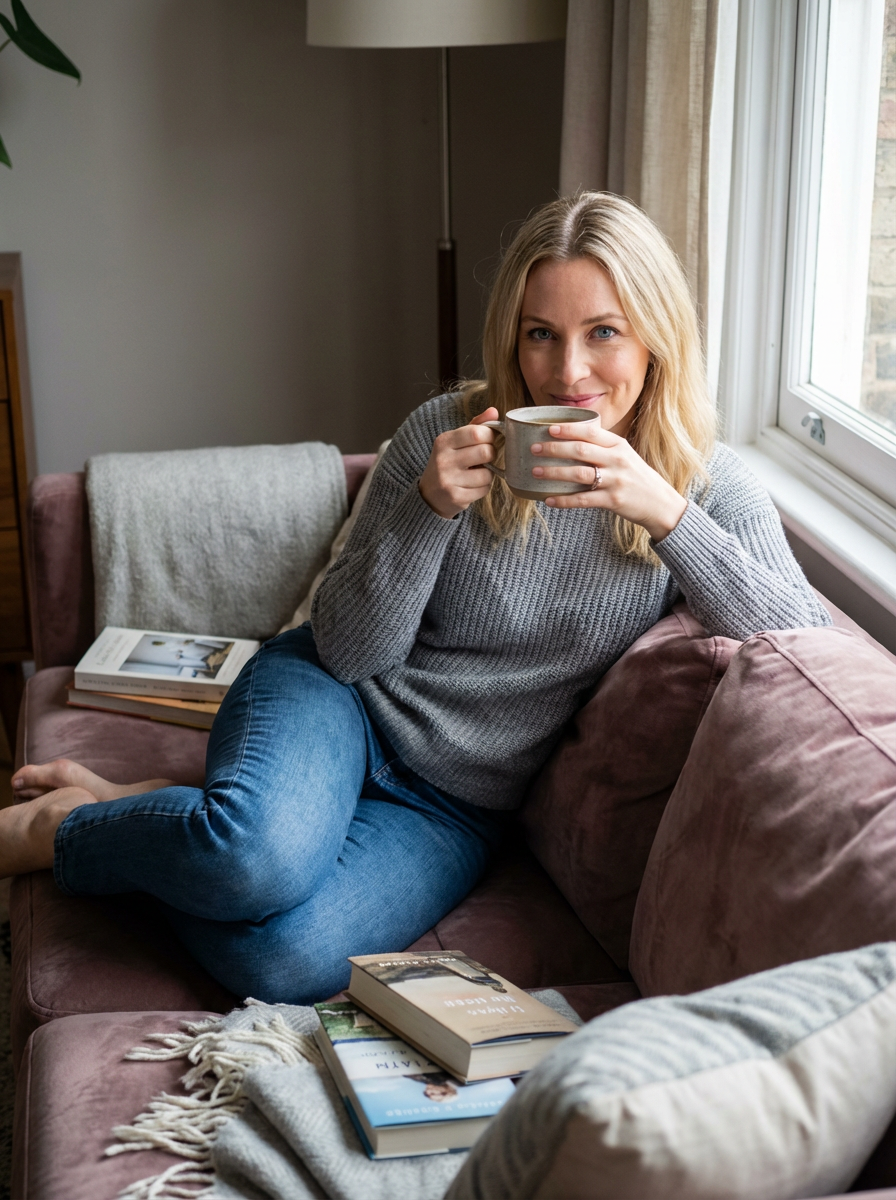 relatable feminine model lounging in casual clothes, sipping tea on a comfy couch