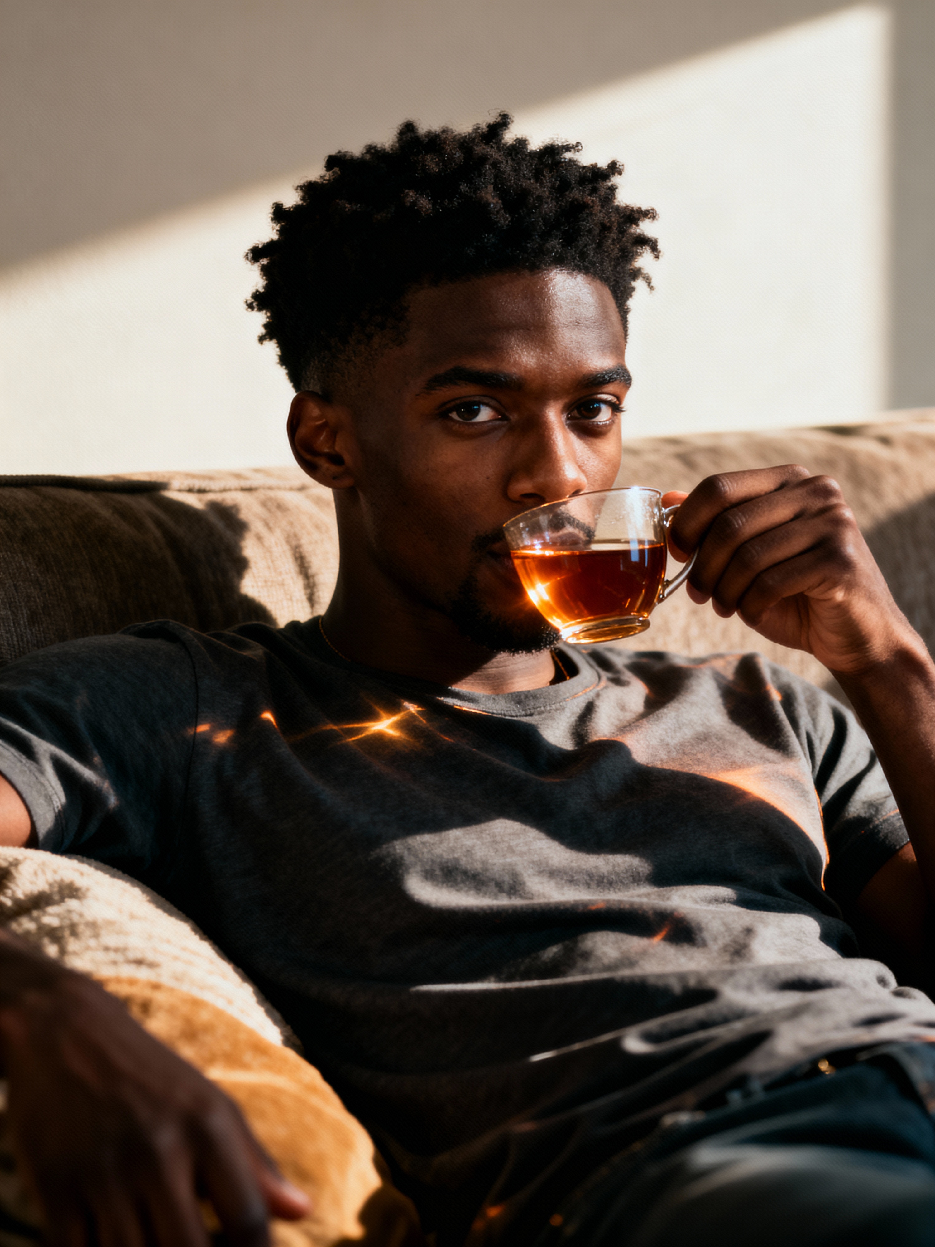 relatable masculine model lounging in casual clothes, sipping tea on a comfy couch