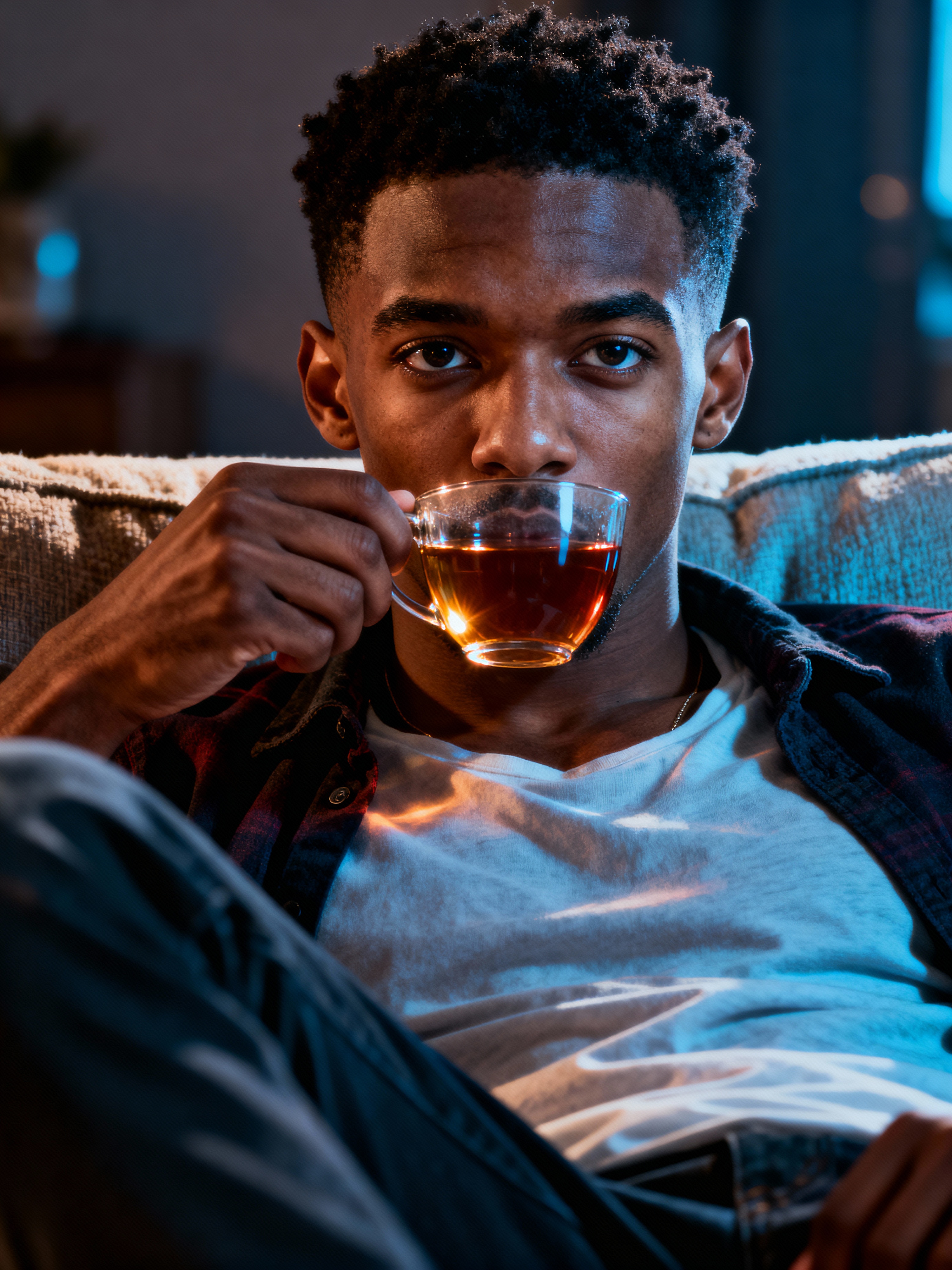 relatable masculine model lounging in casual clothes, sipping tea on a comfy couch