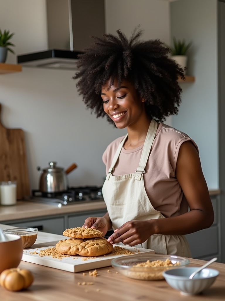 relaxed feminine model cooking or baking in a modern kitchen with a casual vibe