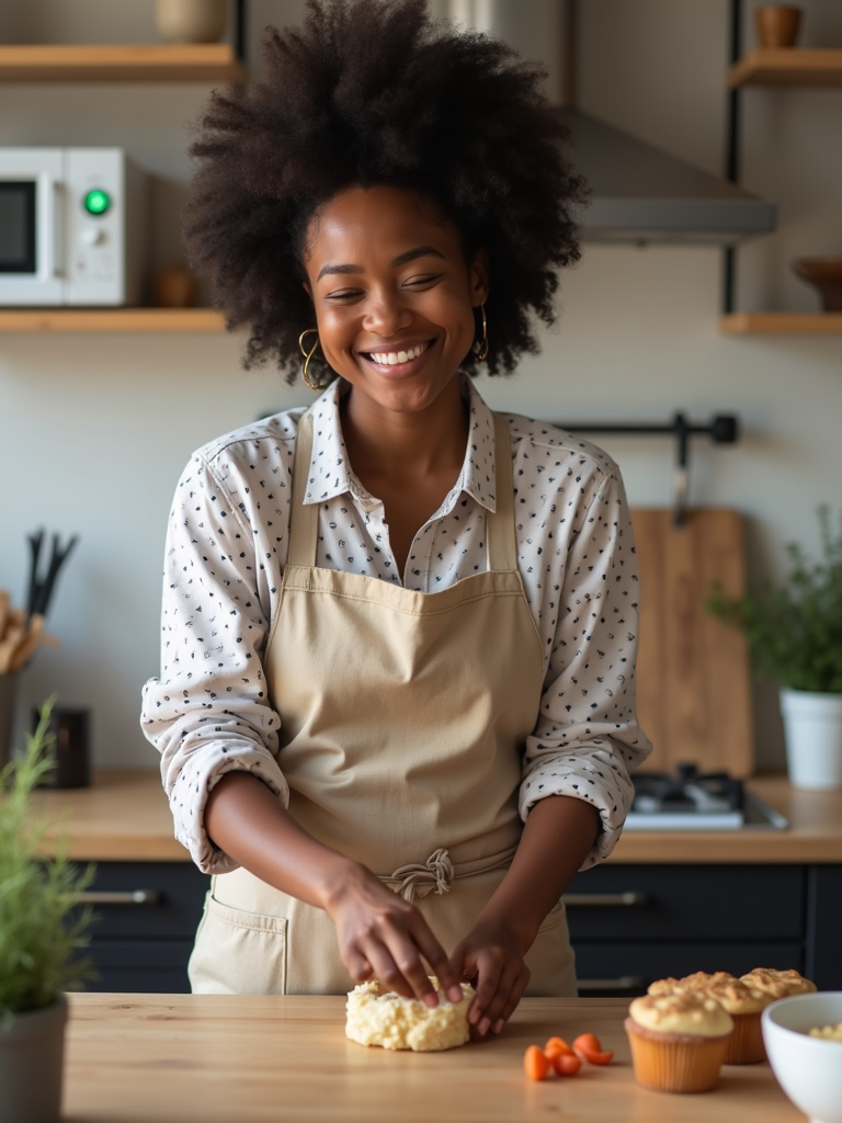 relaxed feminine model cooking or baking in a modern kitchen with a casual vibe