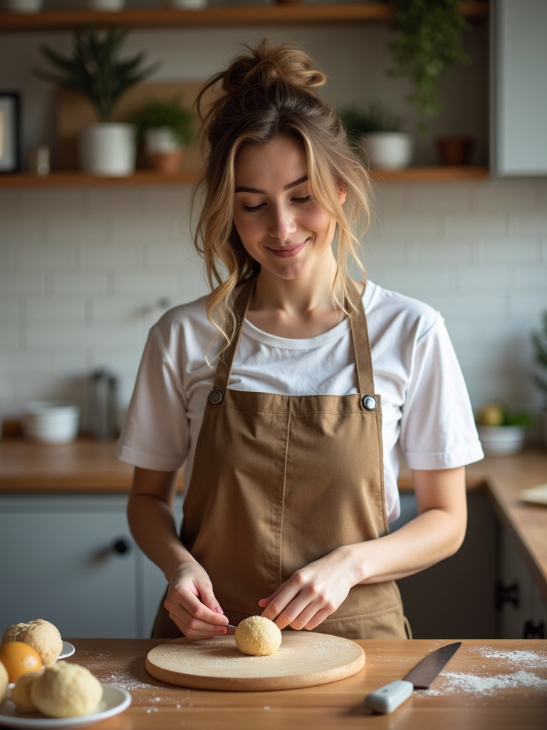 relaxed feminine model cooking or baking in a modern kitchen with a casual vibe